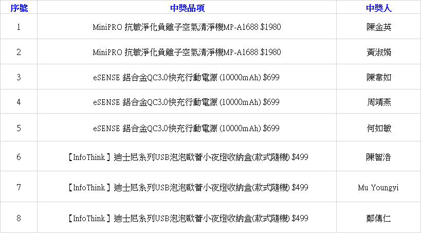 【11/09~11/16 #按讚留言抽 1. MiniPRO 抗敏淨化負離子空氣清淨機MP-A1688 市價$1980(抽2名)/2. eSENSE 鋁合金QC3.0快充行動電源 (10000mAh) 市價$699(抽3名)/3. 【InfoThink】迪士尼系列USB泡泡歐蕾小夜燈收納盒(款式隨機) 市價$499(抽3名)】