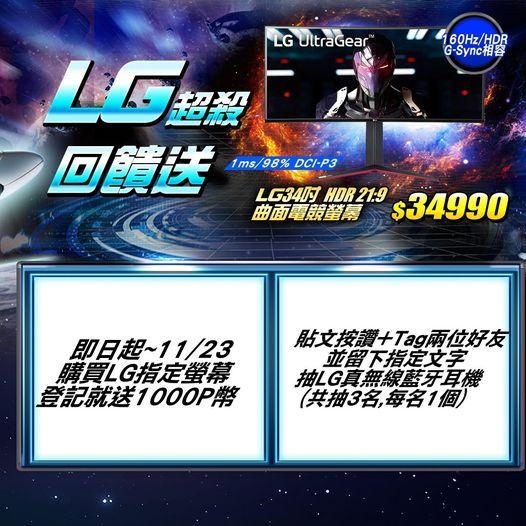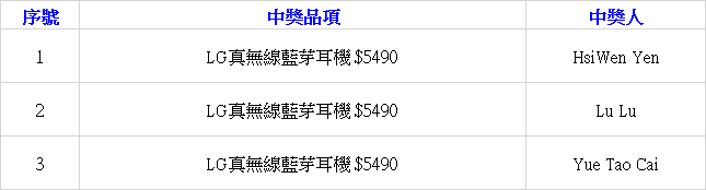 【11/03~11/23 #按讚留言抽 LG真無線藍芽耳機 市價$5490】(抽3名)