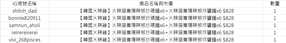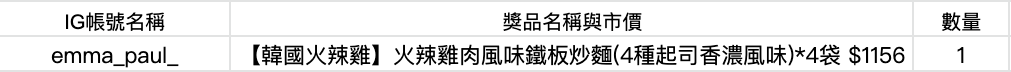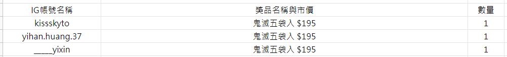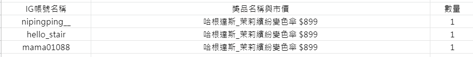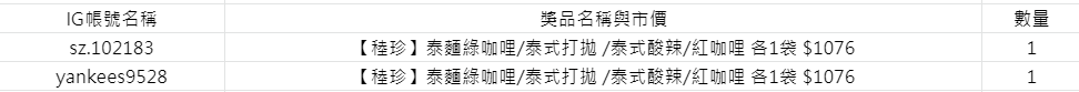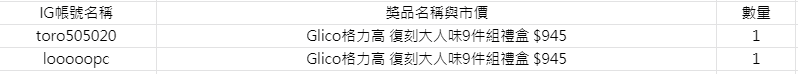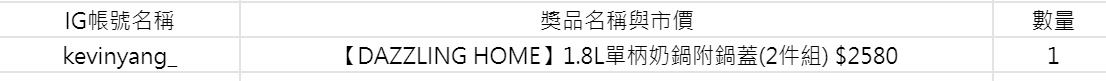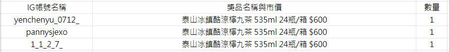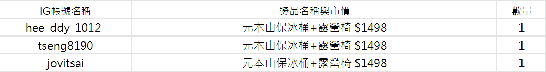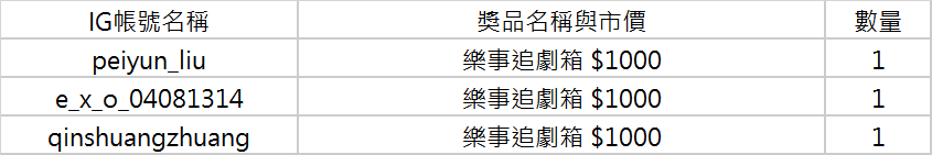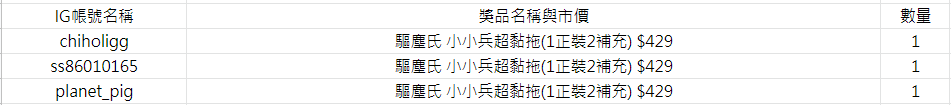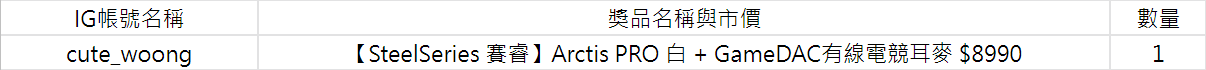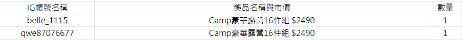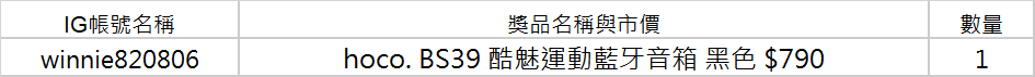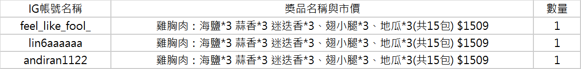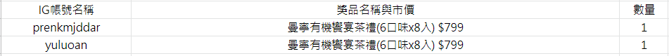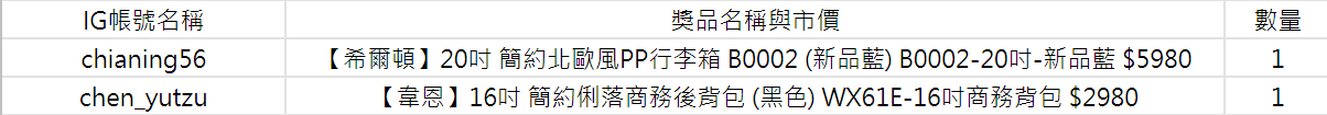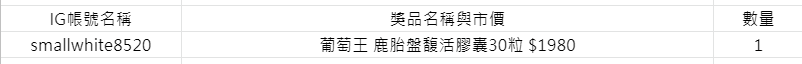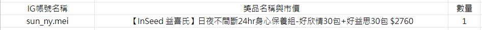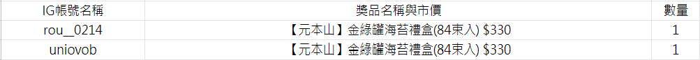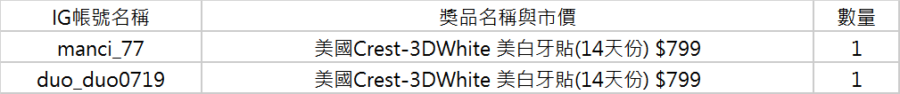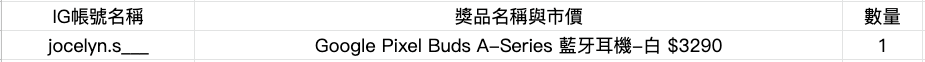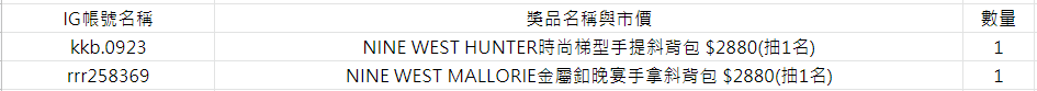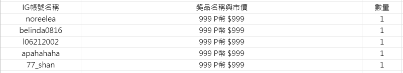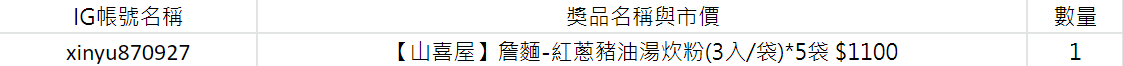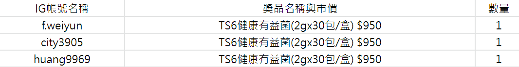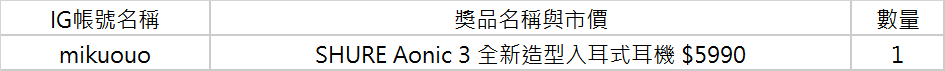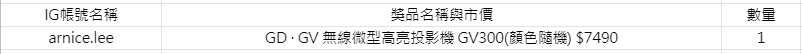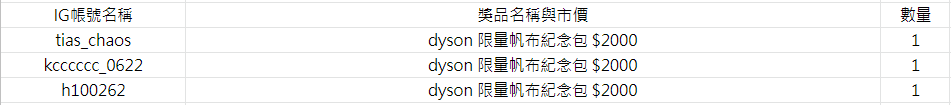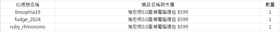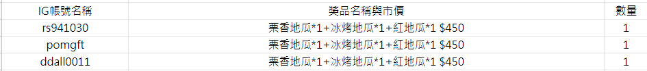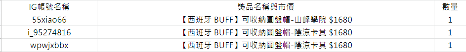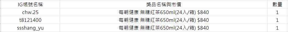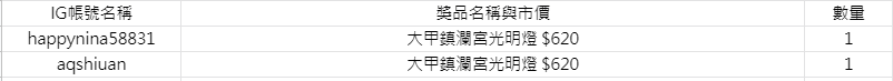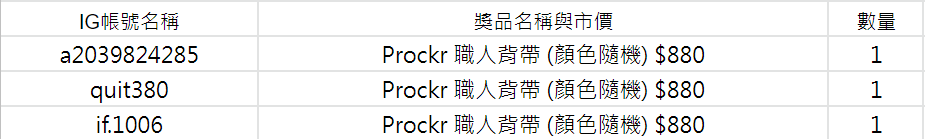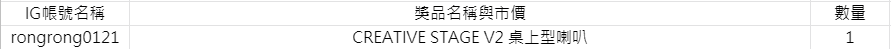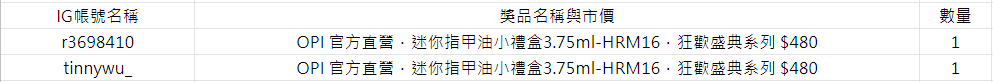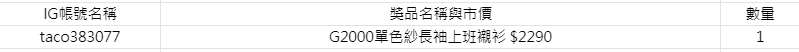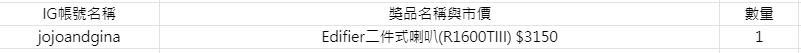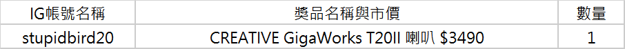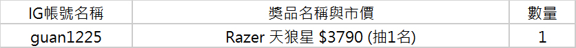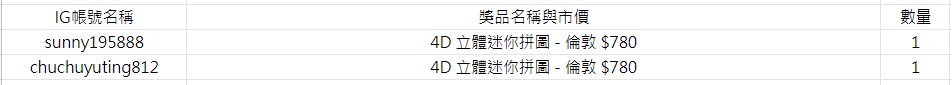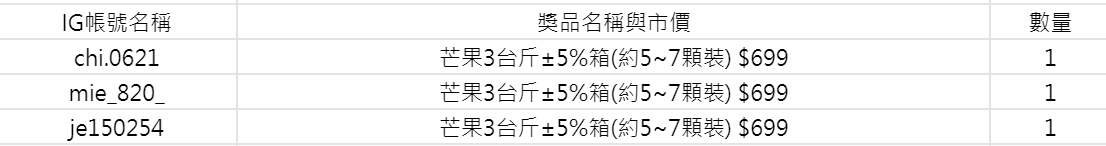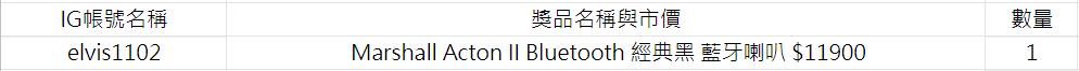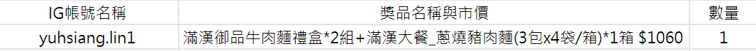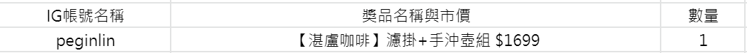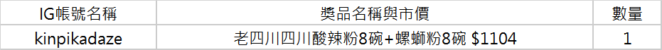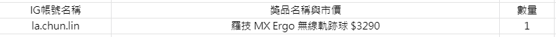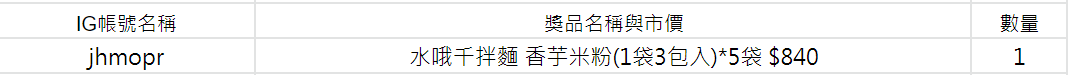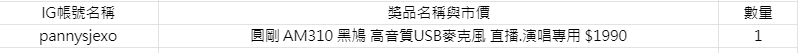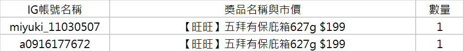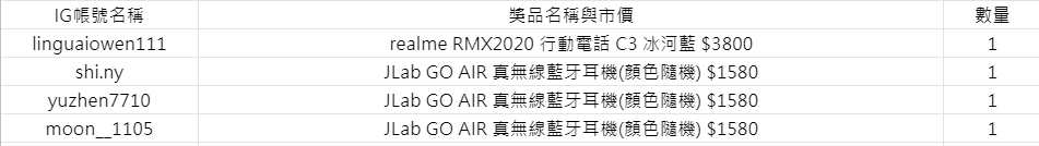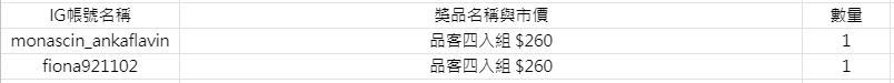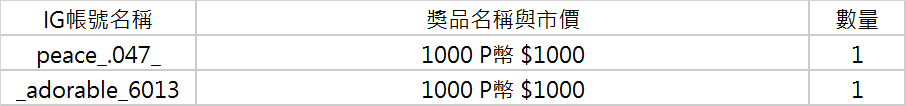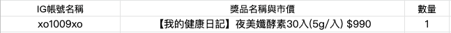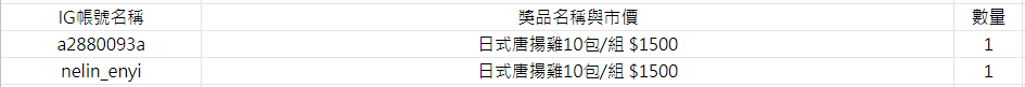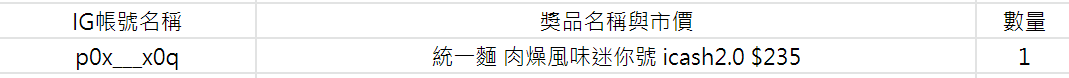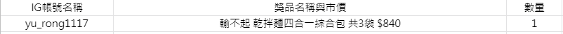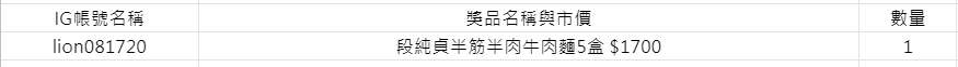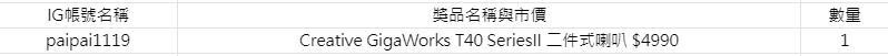 IG帳號名稱 | 獎品名稱與市價 | 數量 |