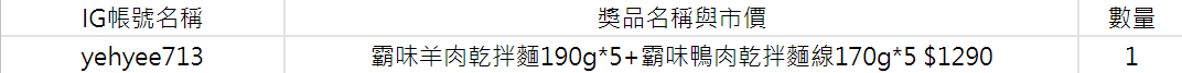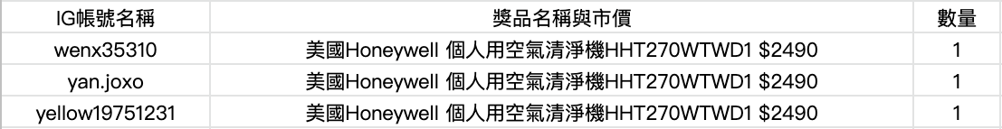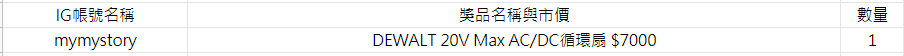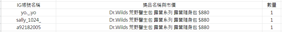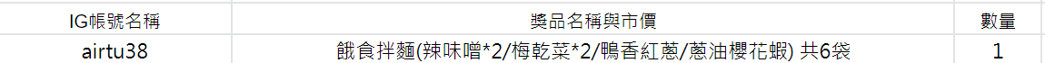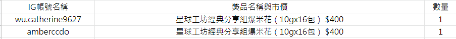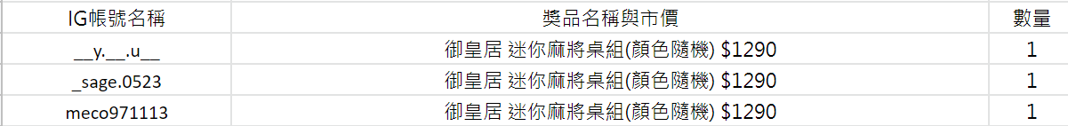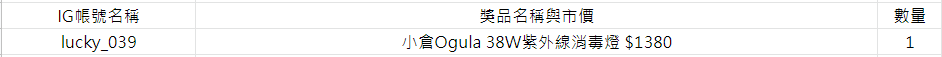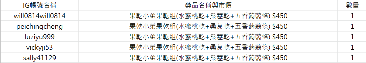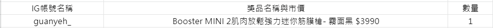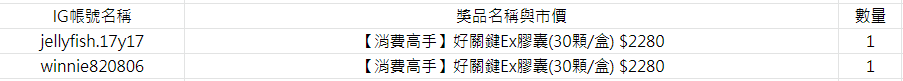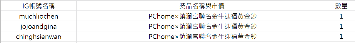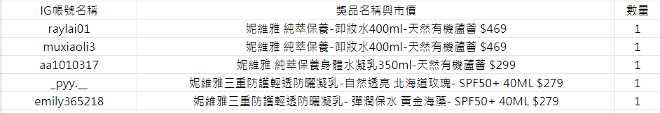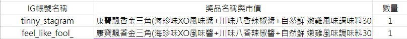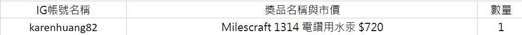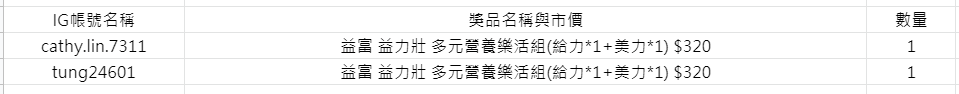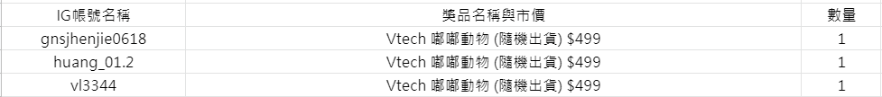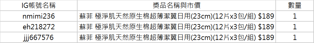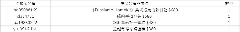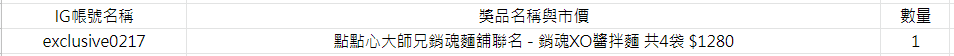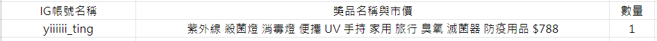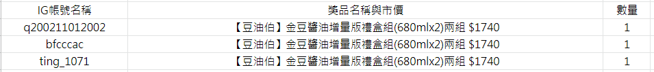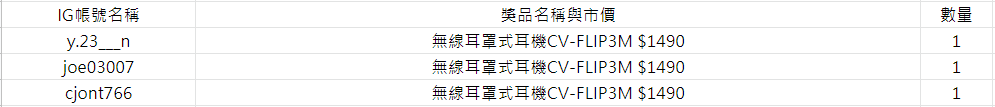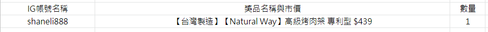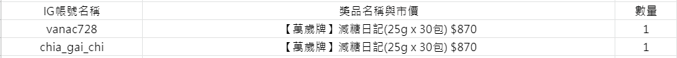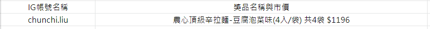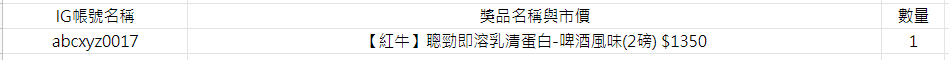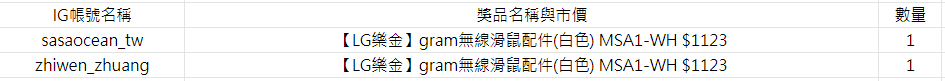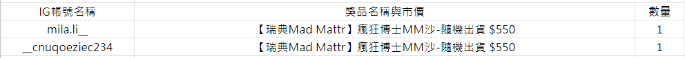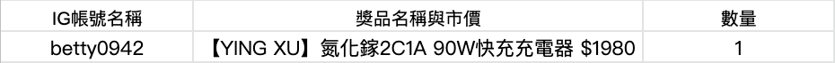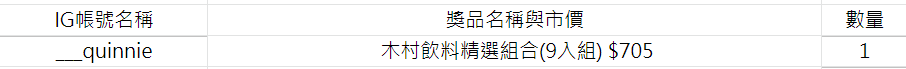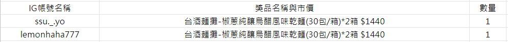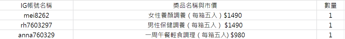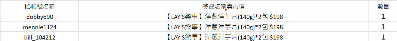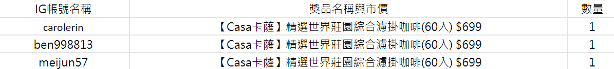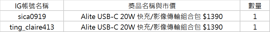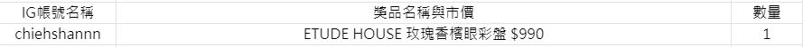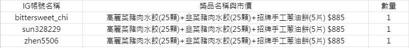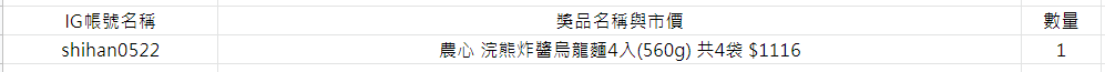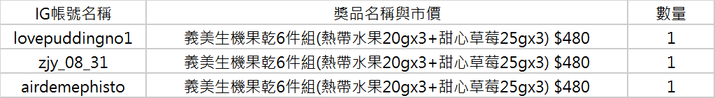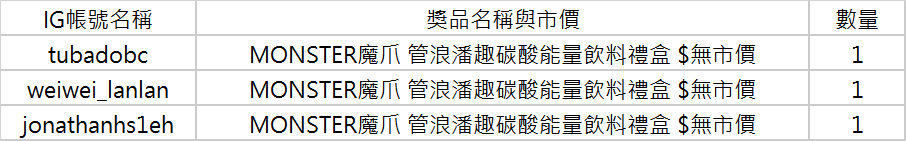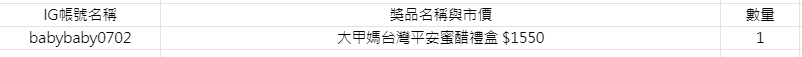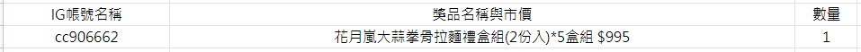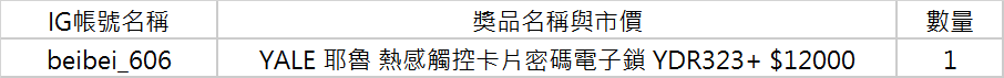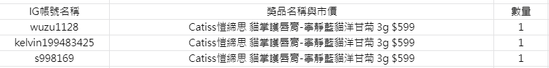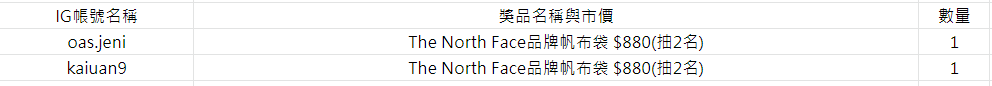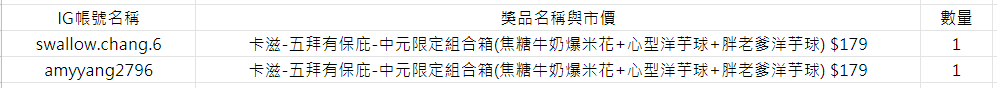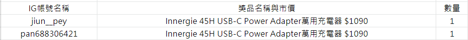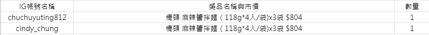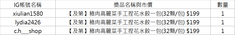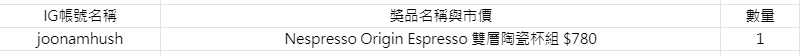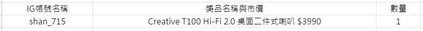 IG帳號名稱 | 獎品名稱與市價 | 數量 |