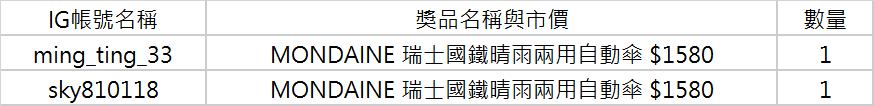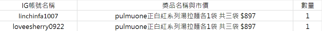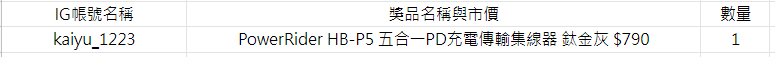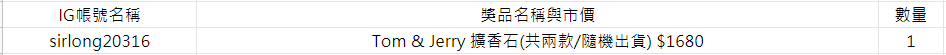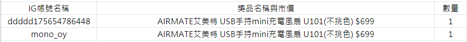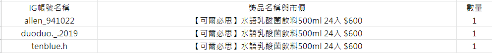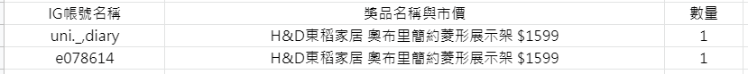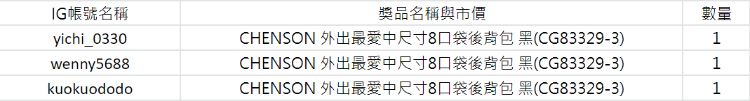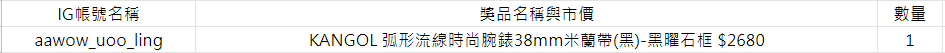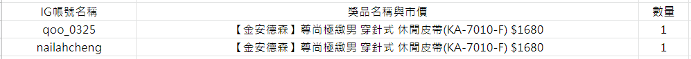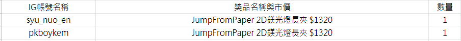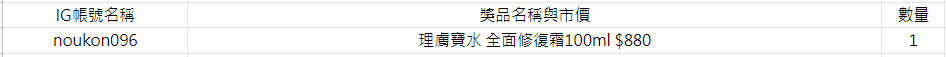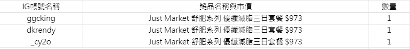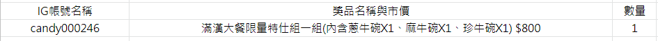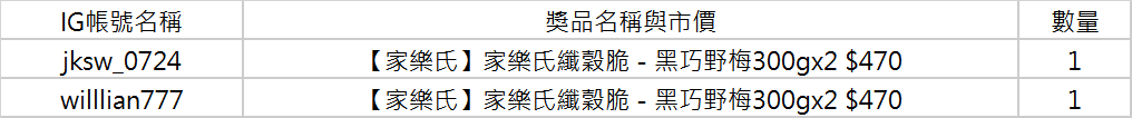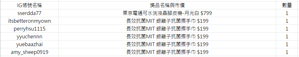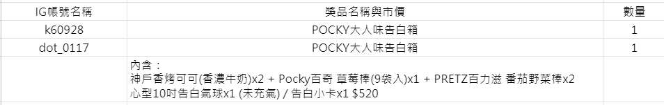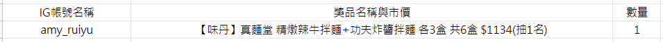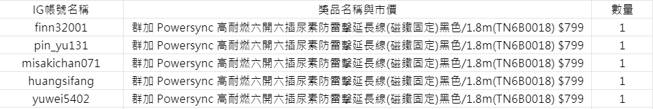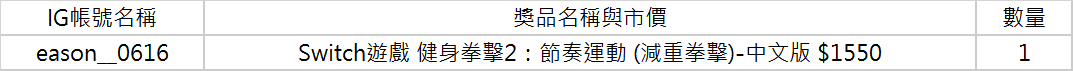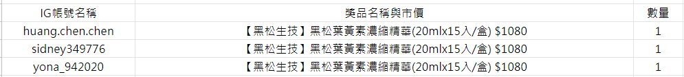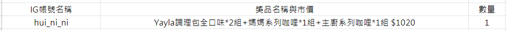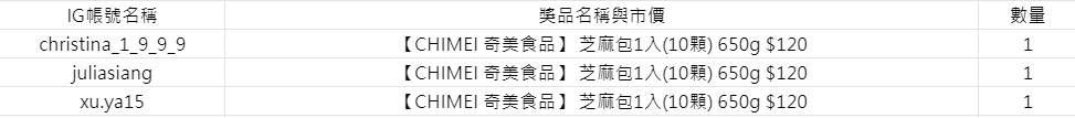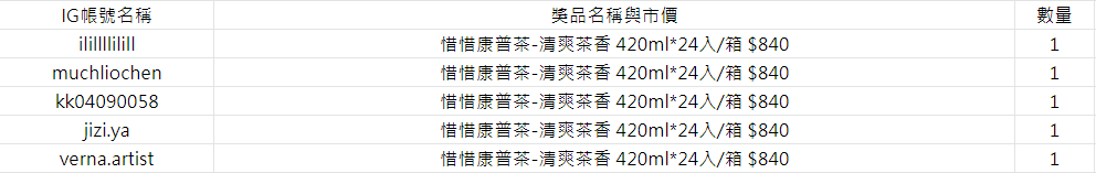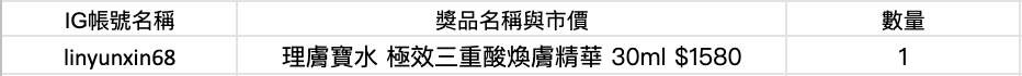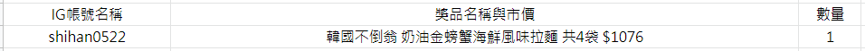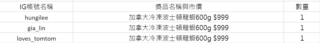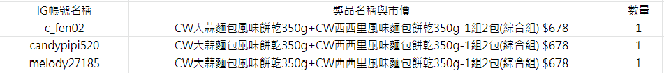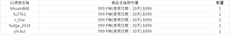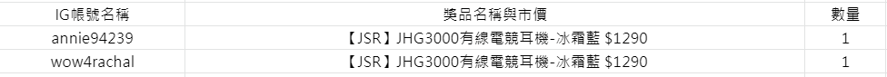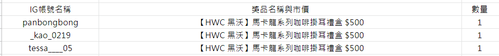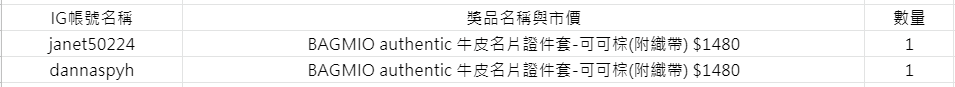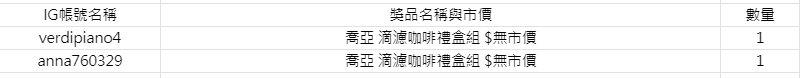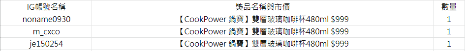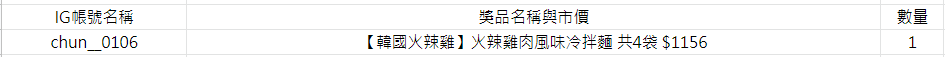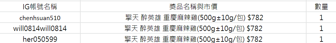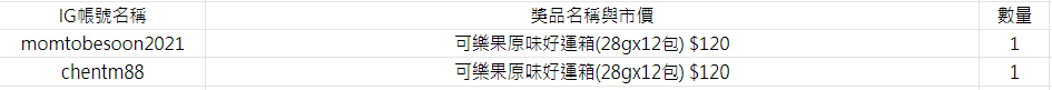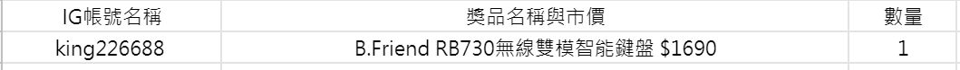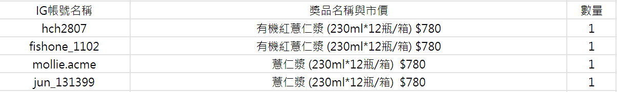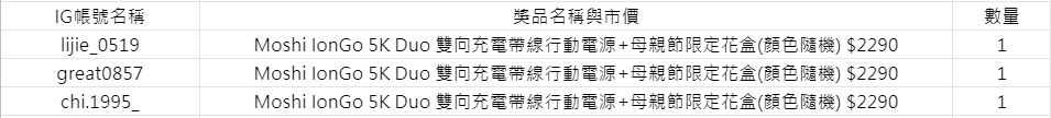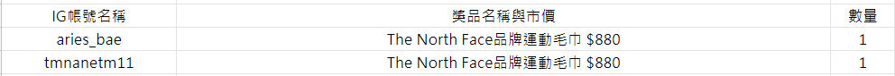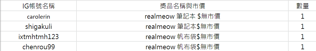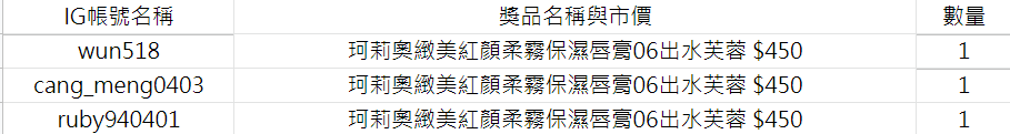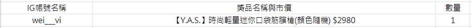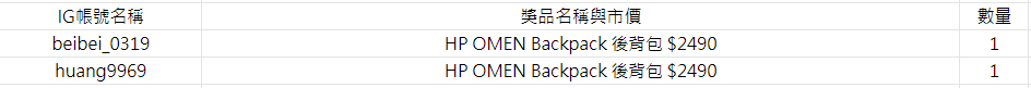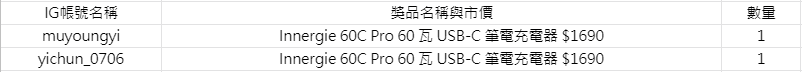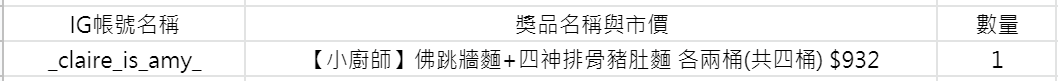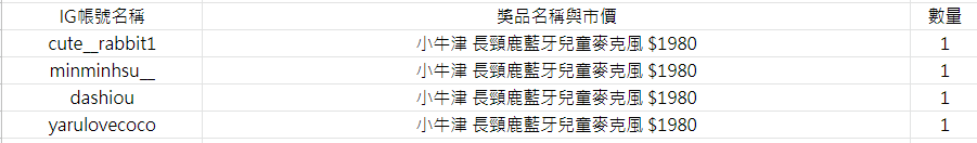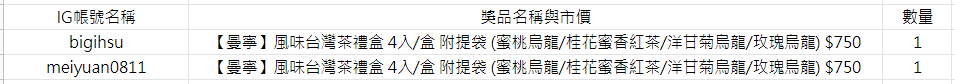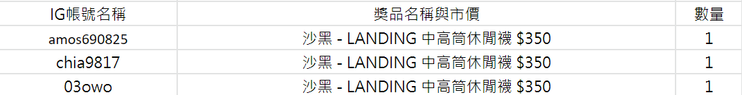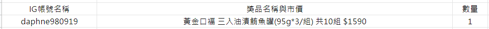 IG帳號名稱 | 獎品名稱與市價 | 數量 |