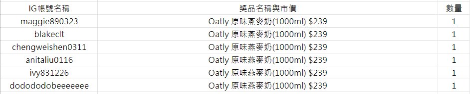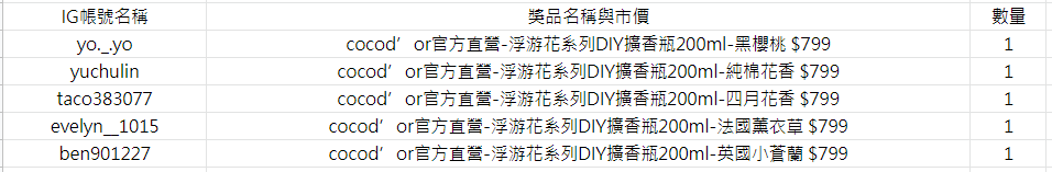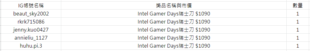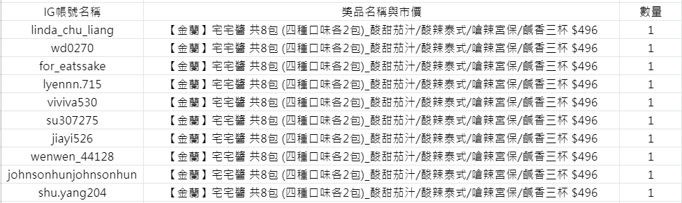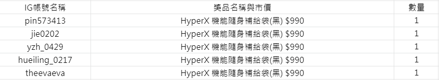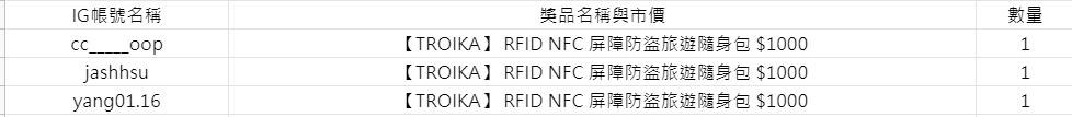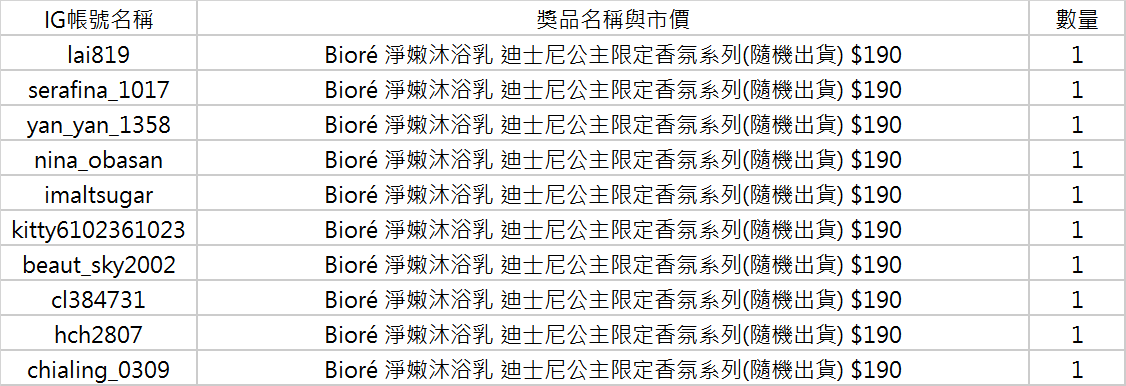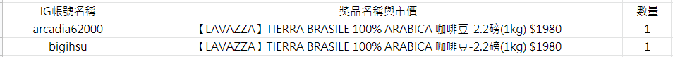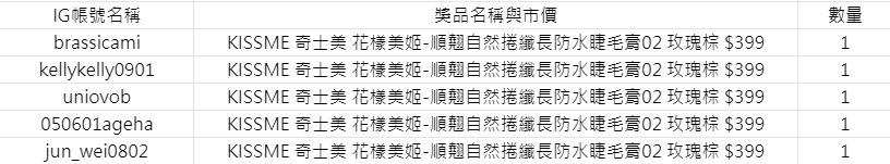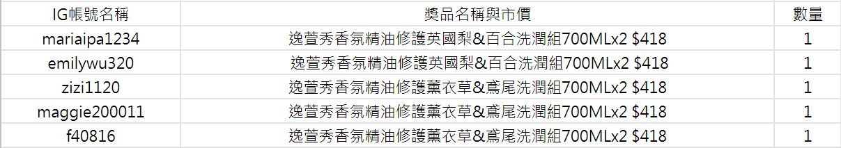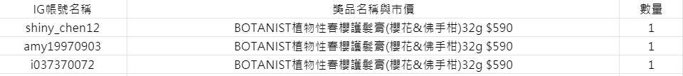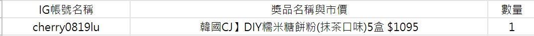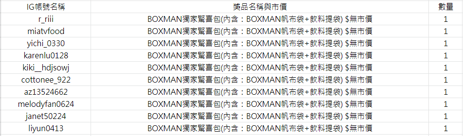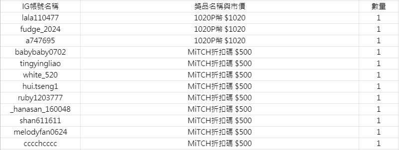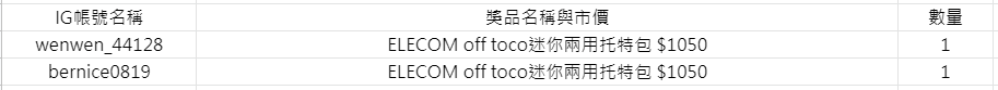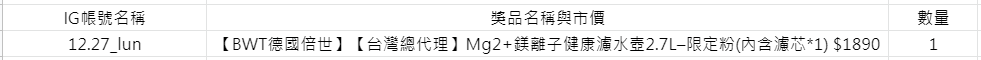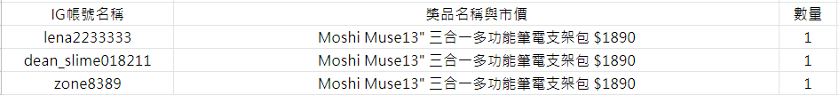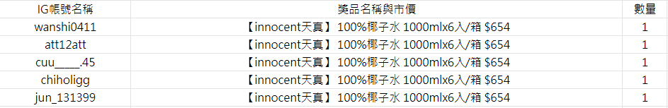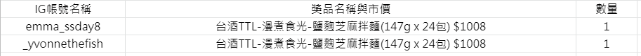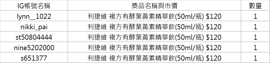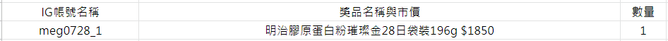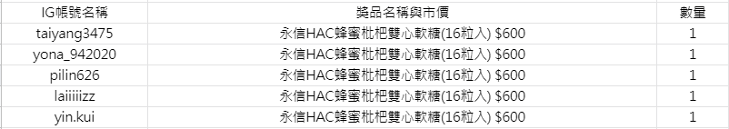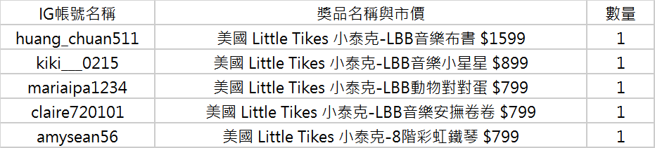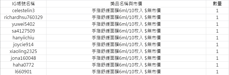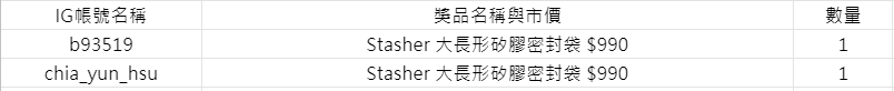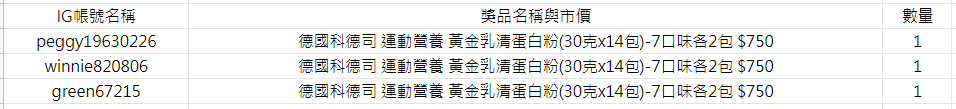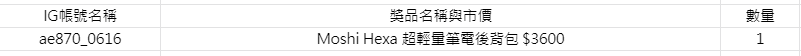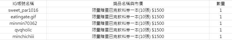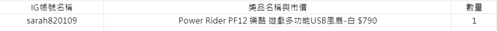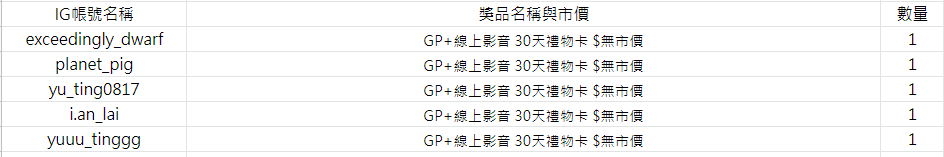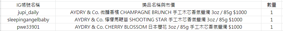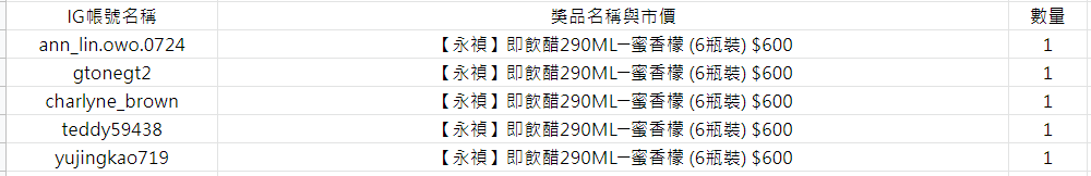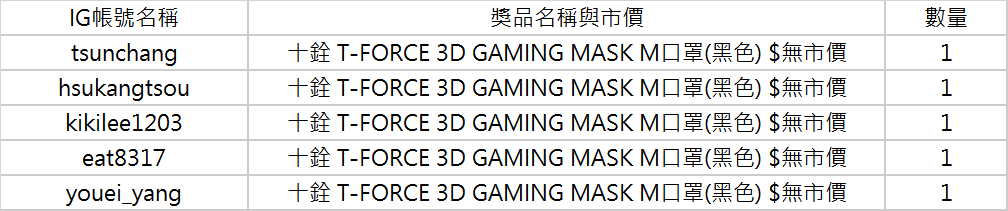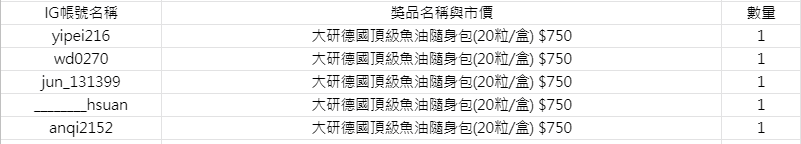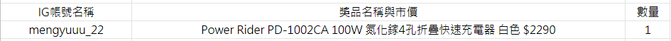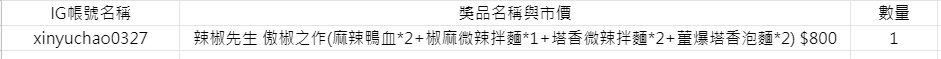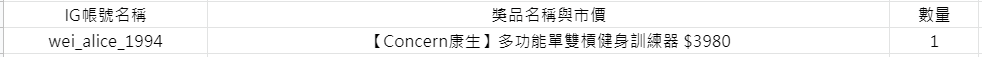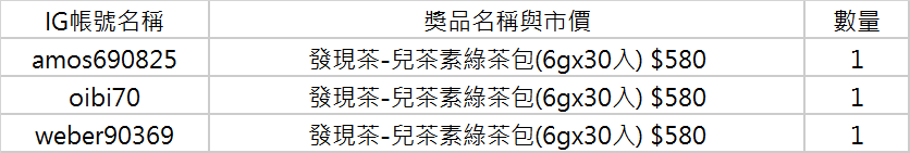IG帳號名稱 | 獎品名稱與市價 | 數量 |