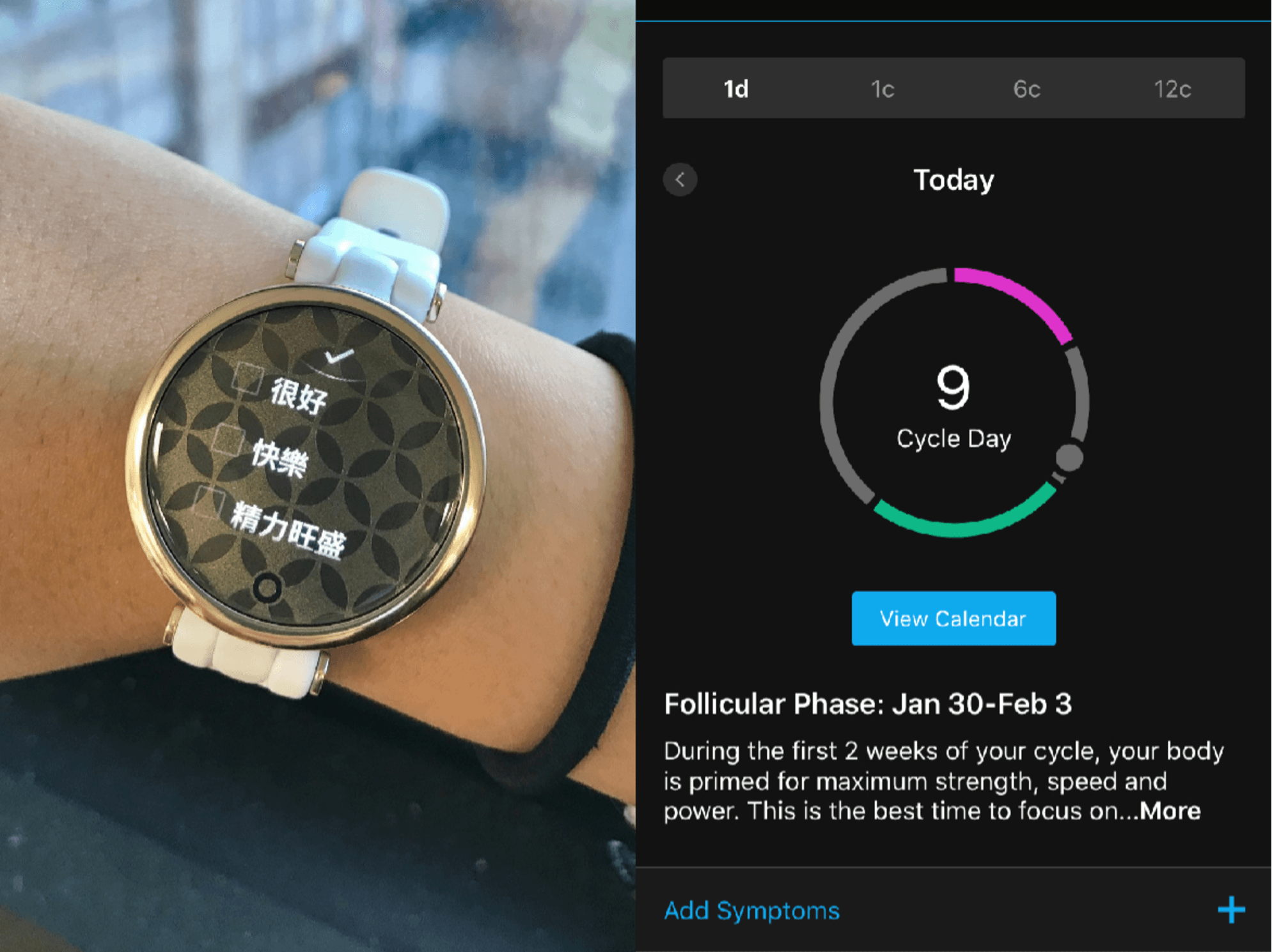 Lily搭配Garmin的APP能夠完整記錄在女生最不適的經期時的症狀、心情、分泌物等等。