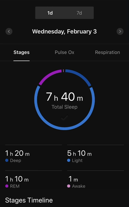 搭配APP-Garmin Connect能夠清楚看到自己一整晚睡眠期間的狀態:深層、淺層、快速動眼期跟清醒次數,非常詳細!