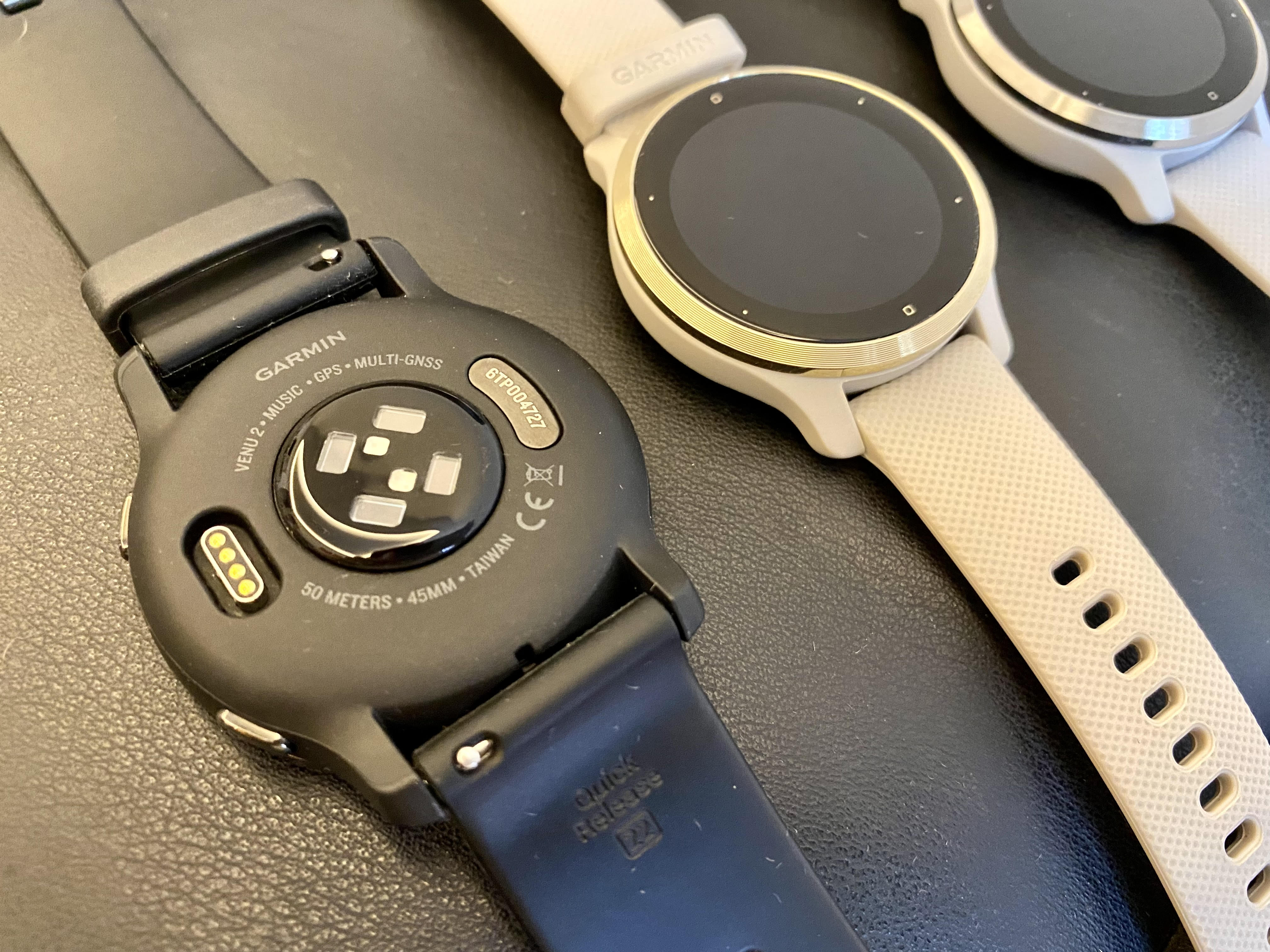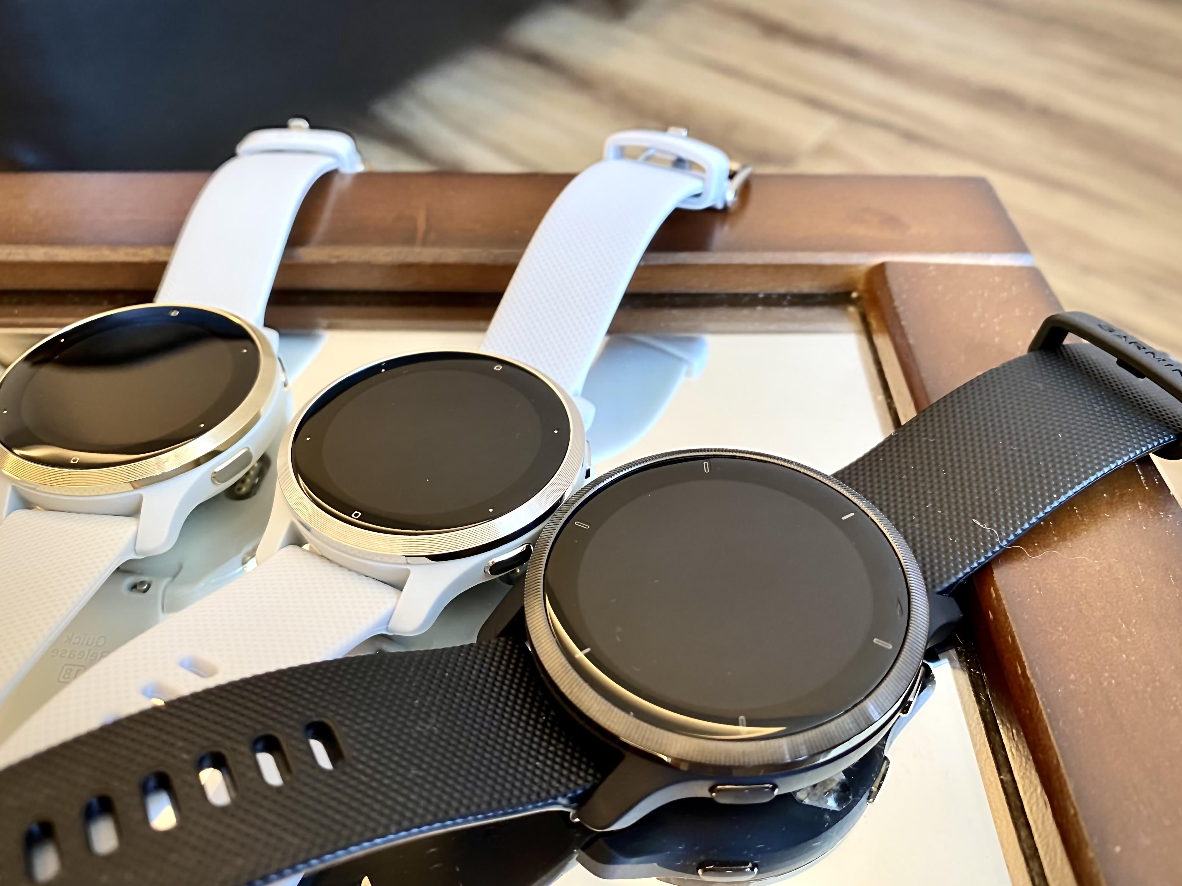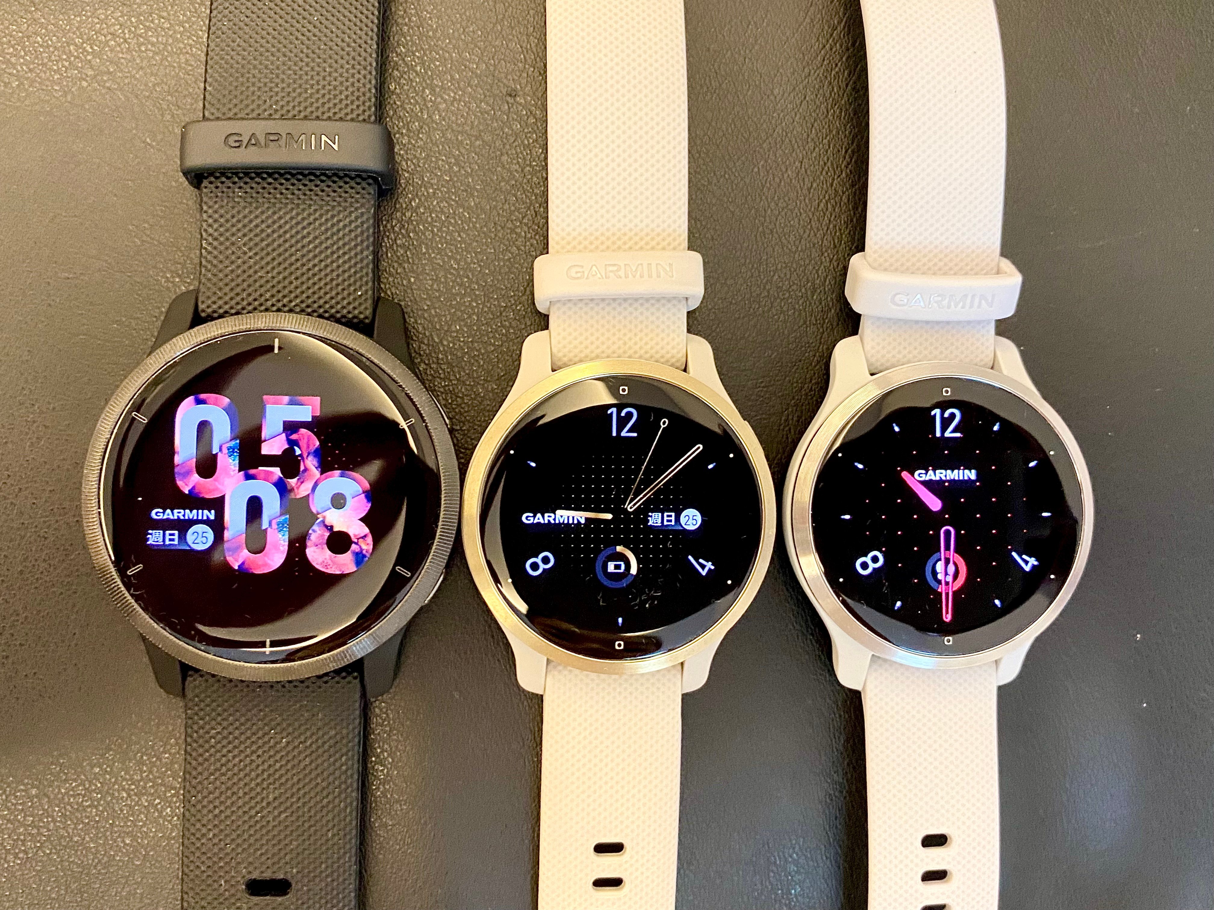 顏色 (由左至右)分別為 : Venu 2 石墨黑 / Venu 2S 白沙香檳金 / Venu 2S 迷霧灰。