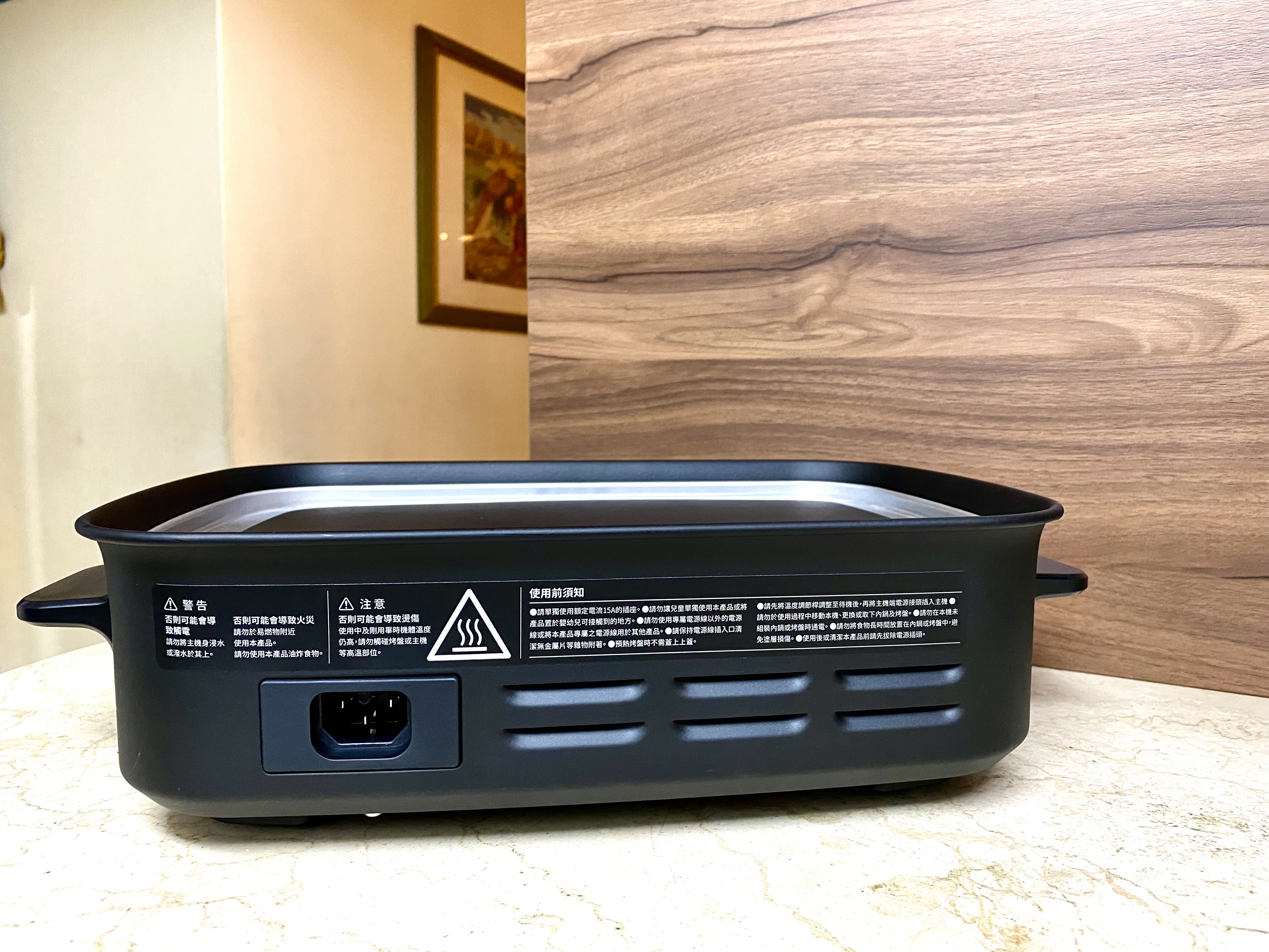 主機面板中間的黑色區域是發熱板,外圍銀色的區域是隔熱板,採用新型平板式加熱管,1300W高功率與厚實鑄鋁烤盤受熱又均勻,可以更快達到理想溫度。