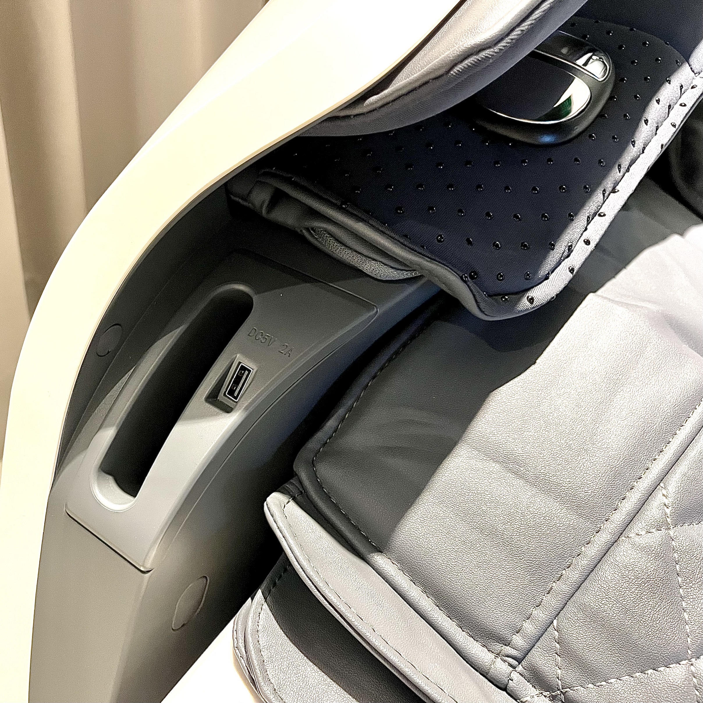 FUJI 智享型摩術椅 FE-7100S,很貼心的在右側扶手設計了專門放置手機的收納凹槽,以及提供USB充電孔。