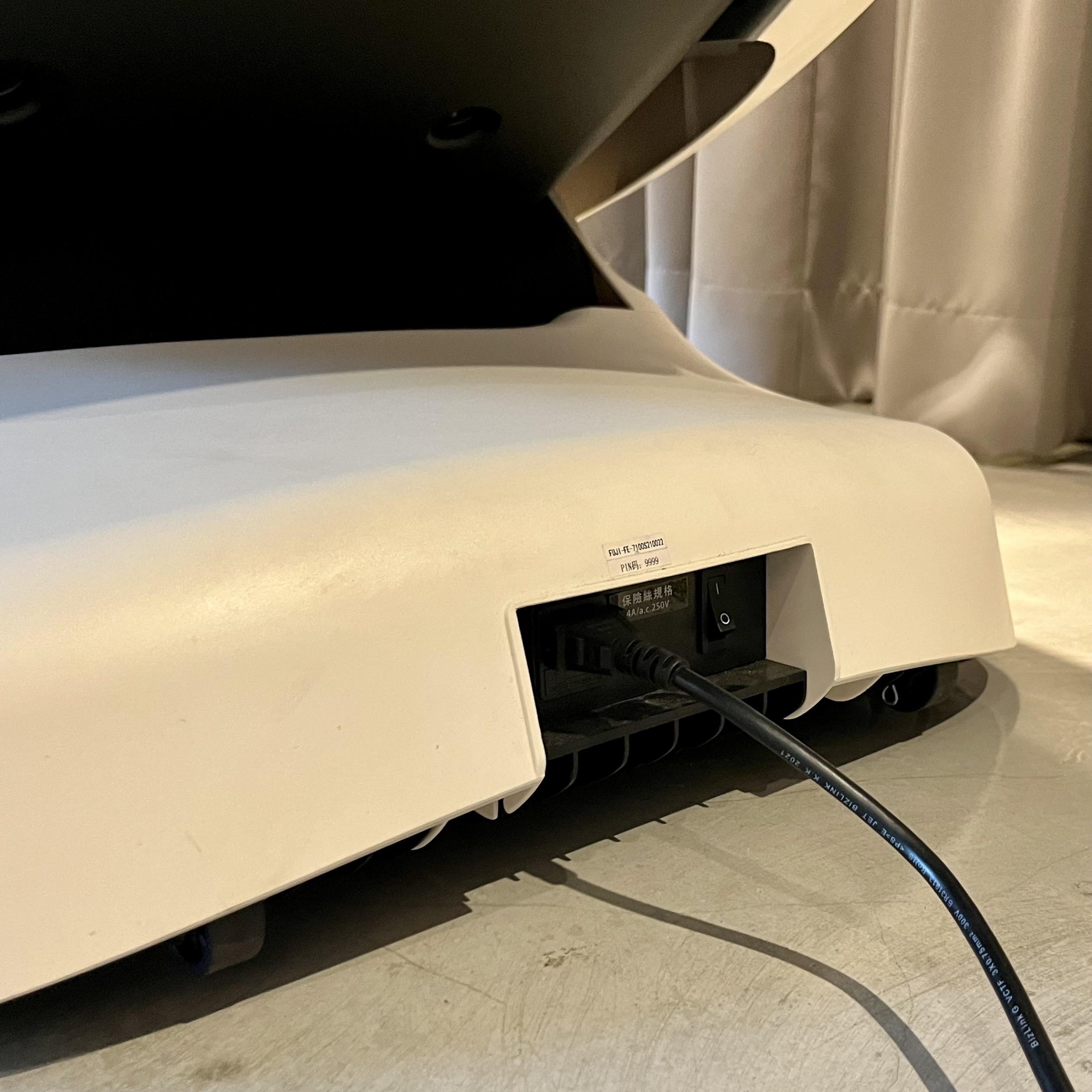 按摩椅的背面設計承襲外觀的簡約風格,在椅背會看到一張按摩椅的規格,機底則是電源的連接處與開關,還有藍芽連接PIN碼等資訊,附帶的電源線大約有170公分。