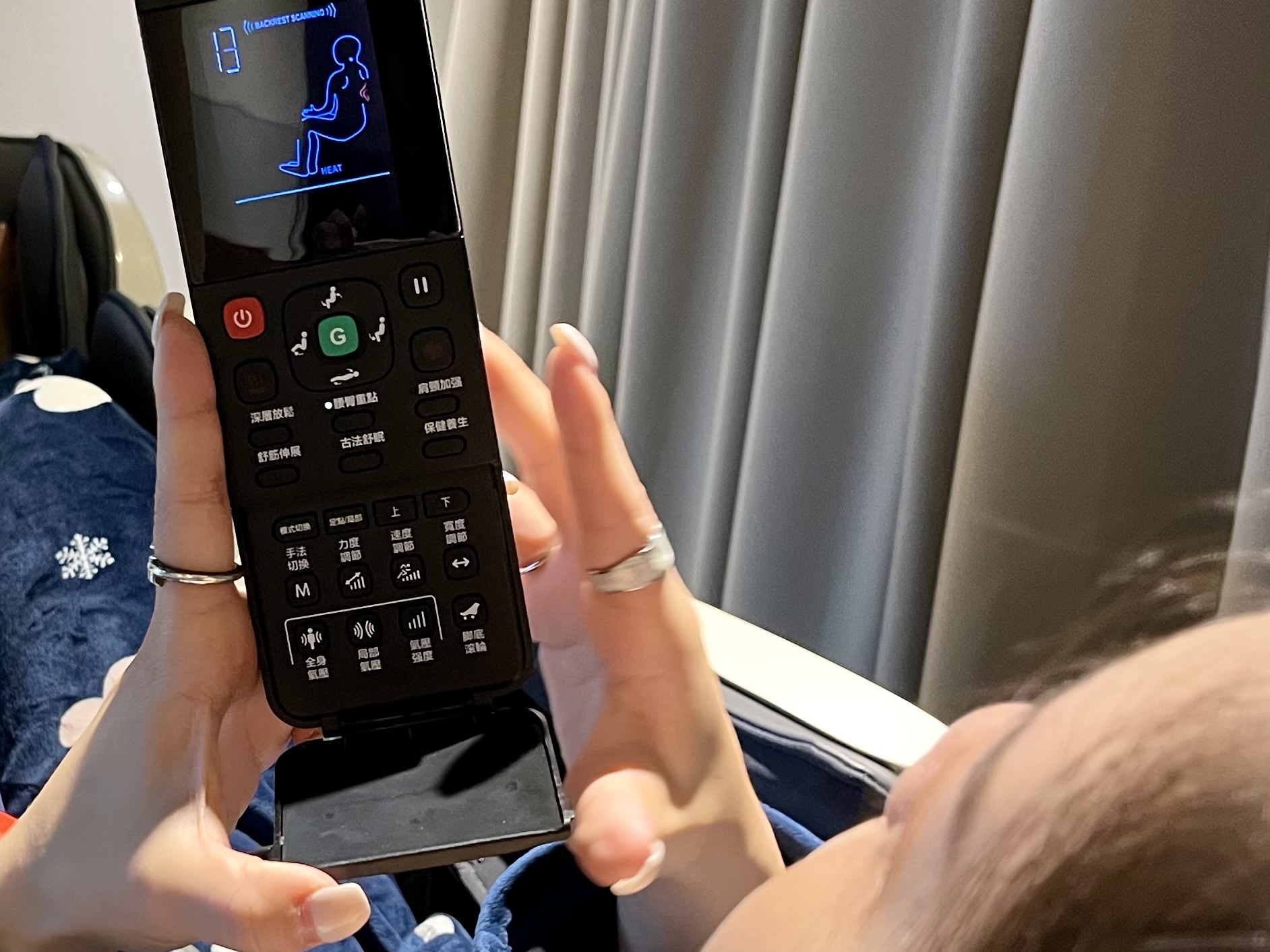 FE-7100S 主要使用隨附的遙控器進行操控,從螢幕上可以查看到目前的按摩狀態,遙控器採用掀蓋設計,可以保護按鈕、防止髒污灰塵,按鈕的鍵程與回饋都很不錯,各模式都有明確的位置,一共收錄深層放鬆、腰臀重點、肩頸加強、舒筋伸展、古法舒眠還有保健養生六個預設的按摩流程。