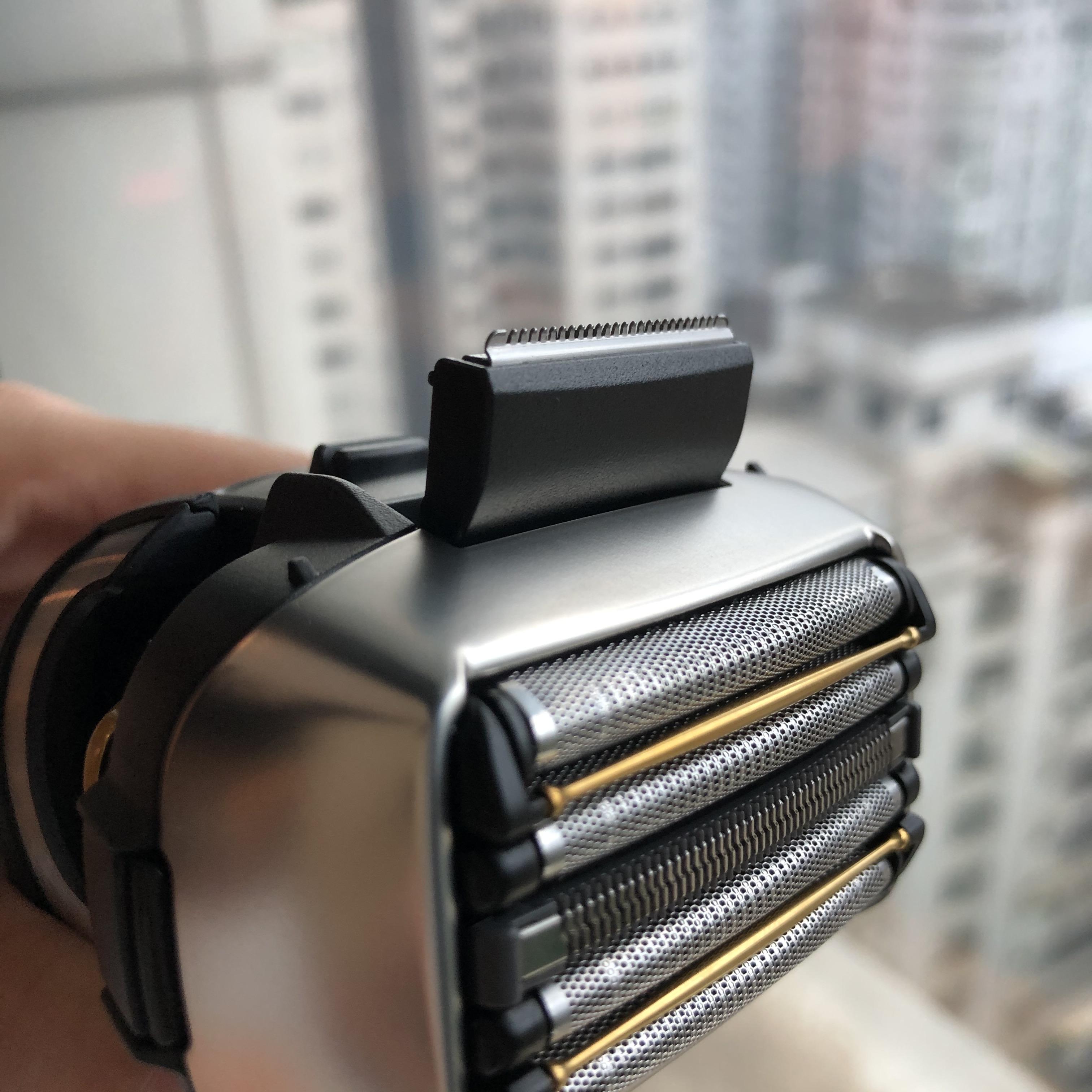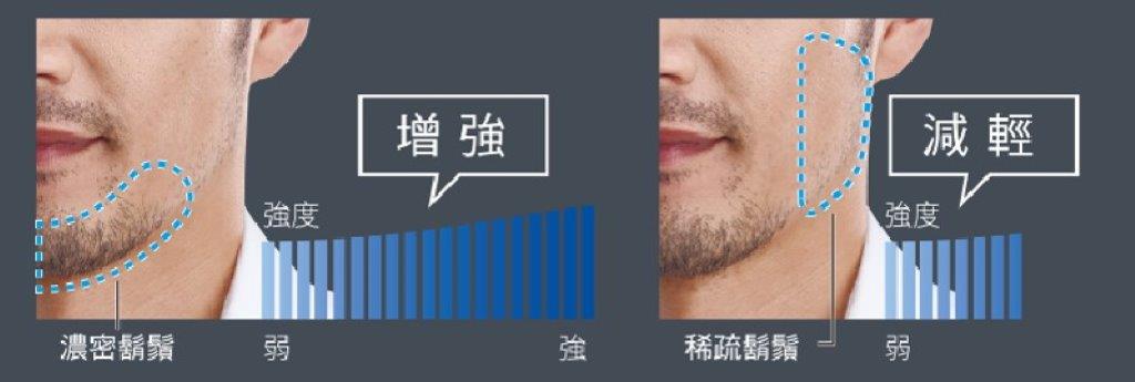 新一代前速刀刃(3)改良角度設計,新精密齒梳抓起較長倒臥鬍鬚。