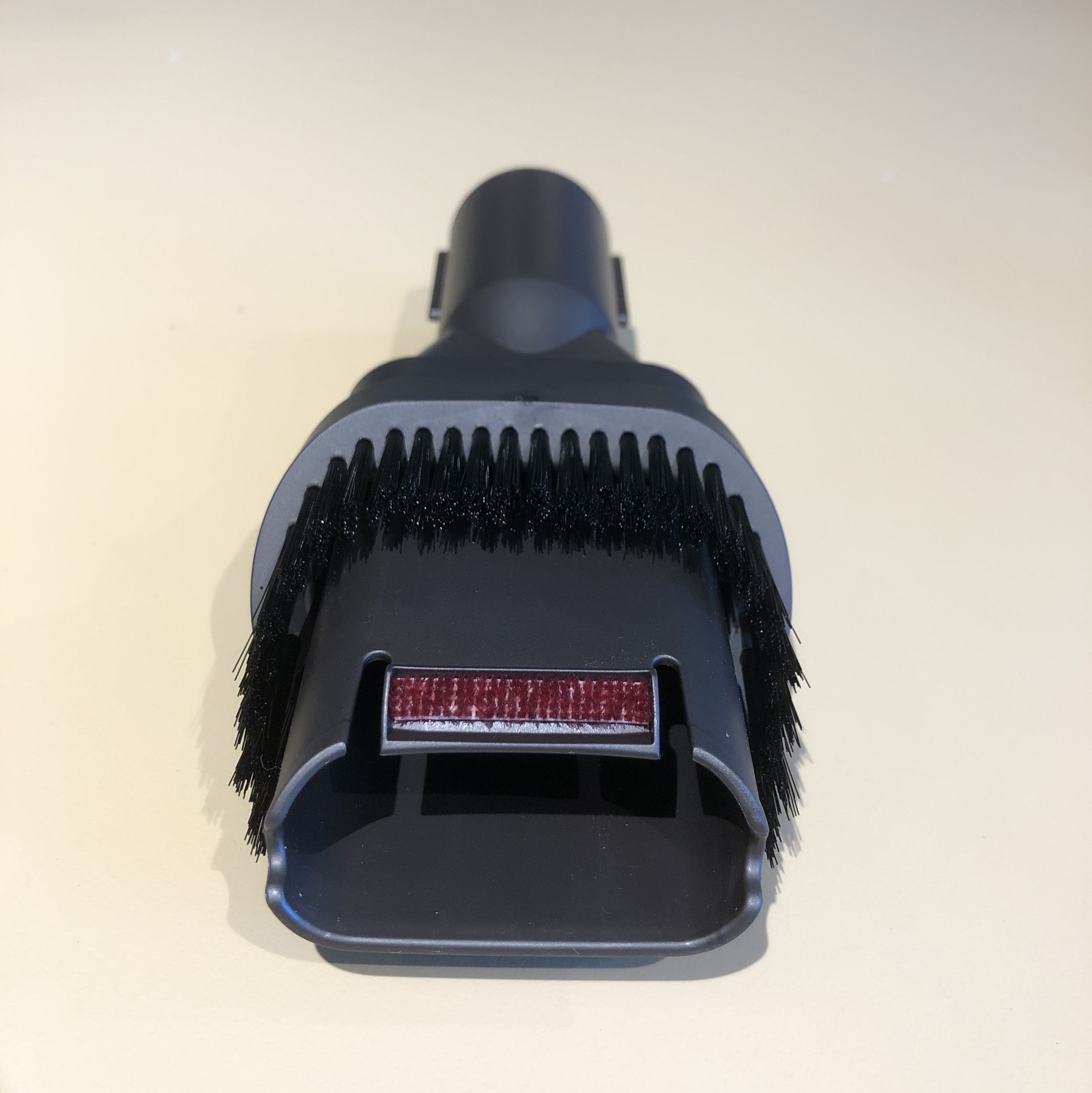 對比傳統fluffy 吸頭,更小、更輕40%的輕量軟質碳纖維滾筒吸頭。軟尼龍絨毛可以補多大型碎屑,黑色是抗靜電碳纖維刷毛,則可以清除懸浮微粒,適合台灣家庭常見的硬質地板。