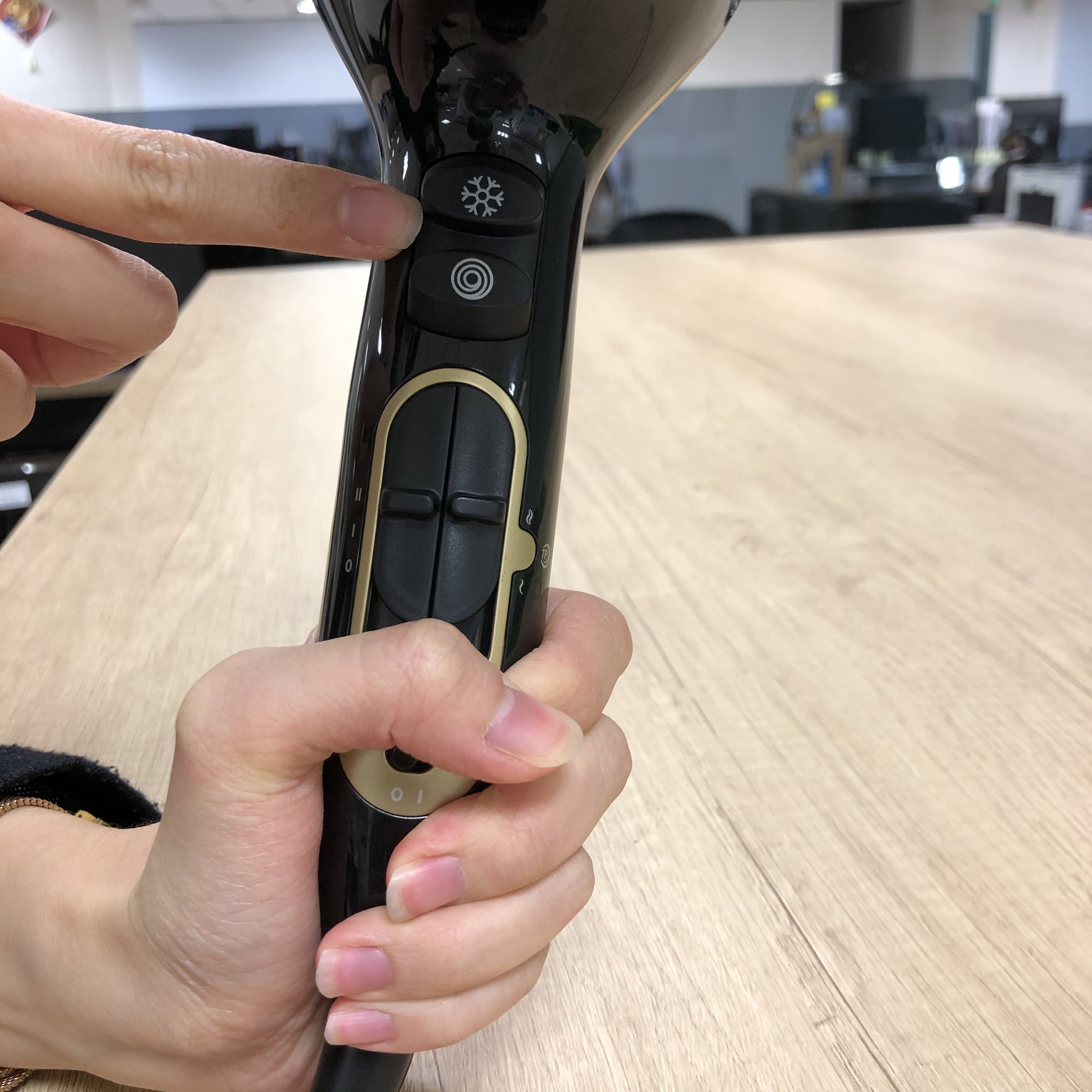 在持握手感上,輕盈俐落的機身,讓你輕鬆造型無負擔。把手中間為功能控制區,外置的冷風鍵及瞬間風力加速鍵,可以在單手持握手把時輕易切換,一鍵按下就可以提供指定的風量功能,玩美造型不受限!