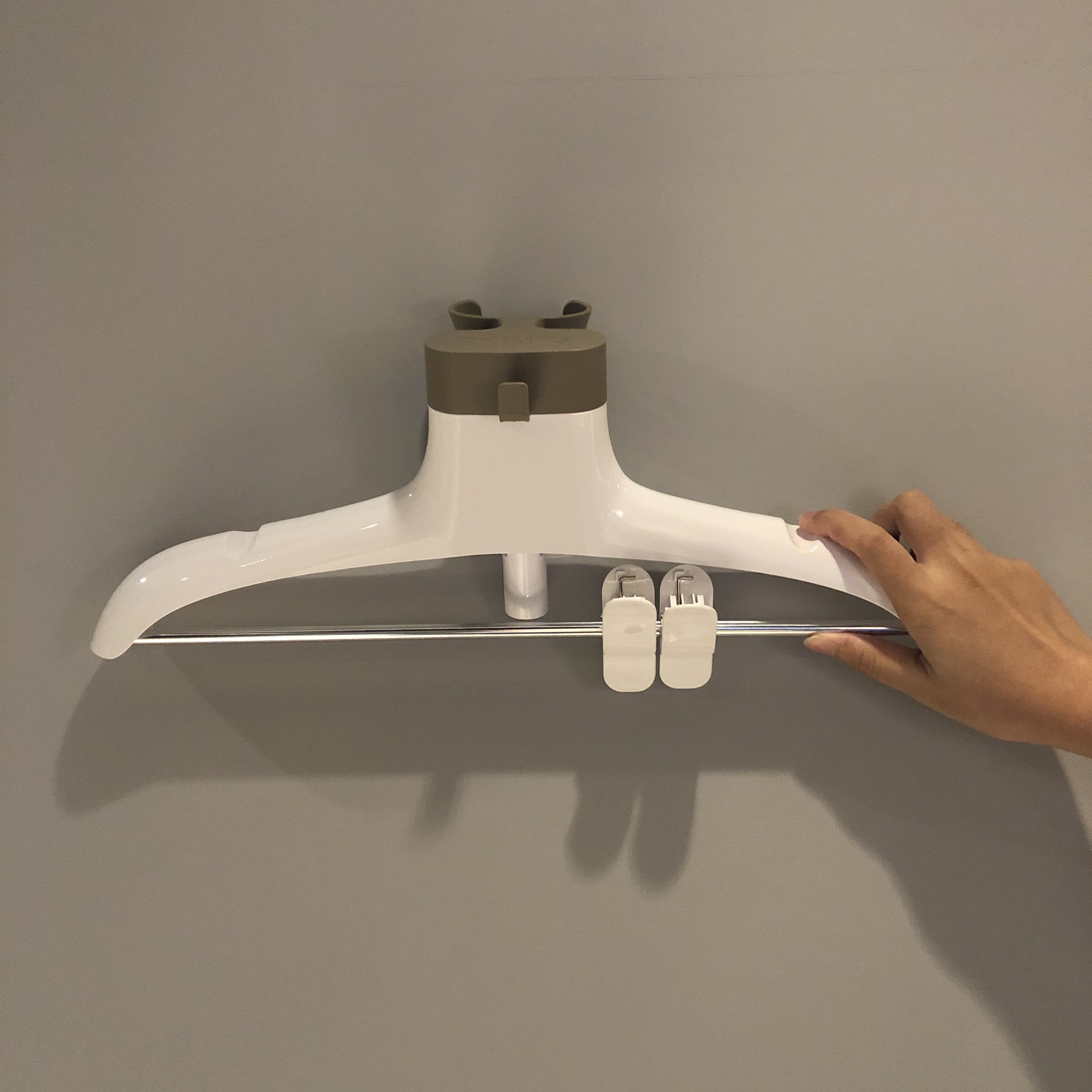 熨燙時可輕鬆地將衣物吊掛,上方凹槽處可懸掛肩帶較細滑的衣服,下方附上的夾子也能將褲子牢牢固定在衣架上,不擔心整燙過程中滑落。