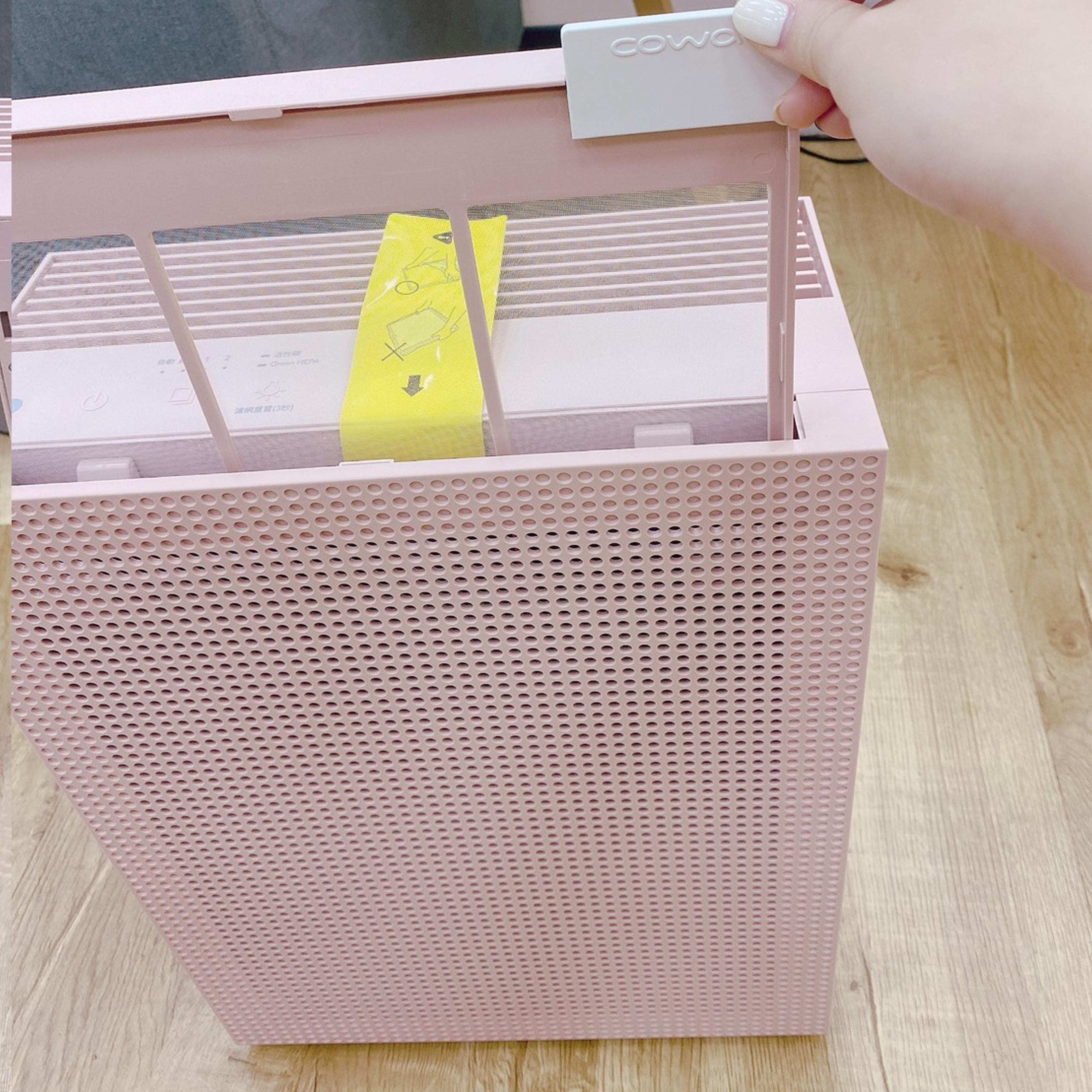 Coway積木機有一個非常貼心的設計,要水洗濾網時,不需開外蓋,直接「上拉」即可輕易取出前置濾網。清洗後可以磁吸於外蓋前方,風乾之後再放進機身。