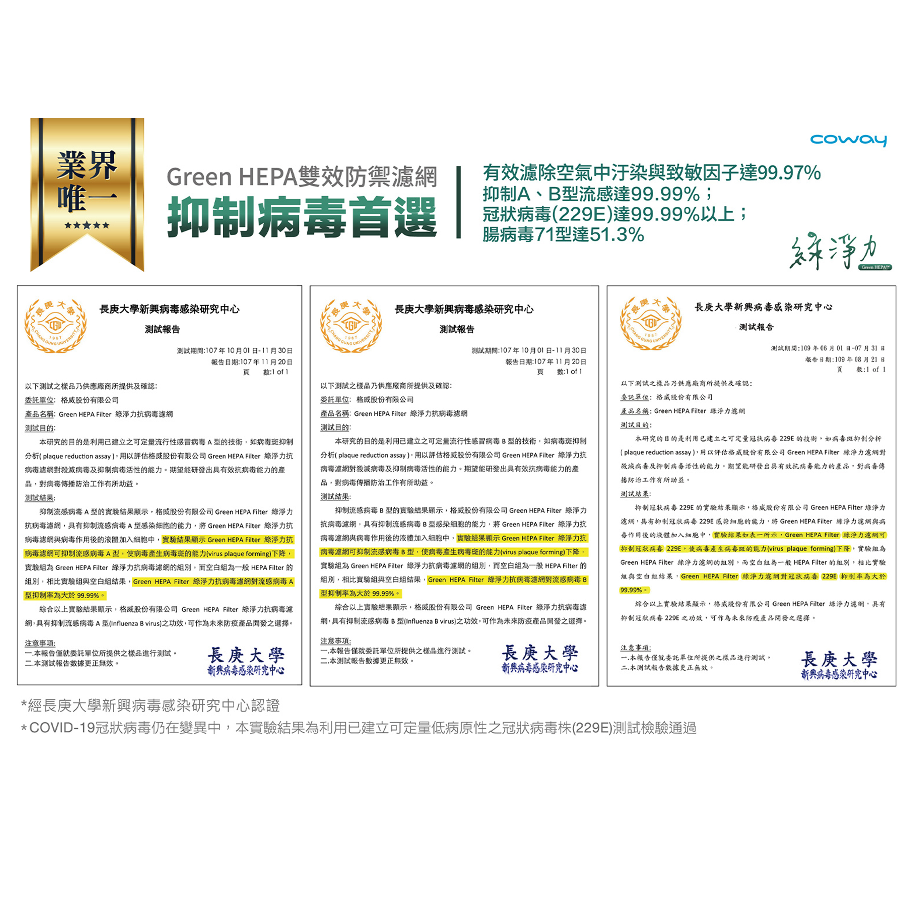 說到Coway空氣清淨機,值得一提的,就是Coway的濾網,採用HEPA H13醫療等級的濾網外,獨特的綠淨力 Green HEPA技術,空氣傳播的AB型流感、冠狀病毒(229E)通通Out,還有日常生活中懸浮微粒、過敏原和二手菸都可以通通擋住,還你清淨空氣!