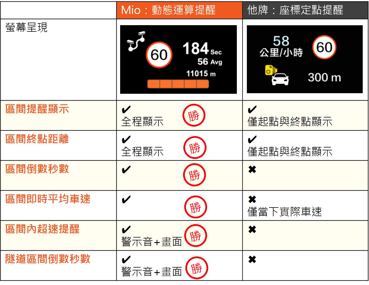 裝配 Mio 行車記錄器的優勢就是遇區間測速點時,提醒功能會在螢幕上全程顯示區間倒數秒數,超速也會發出警示提醒,駕駛就算不了解區間測速的原理,也知道自己是否超速。Mio 提醒功能如下: