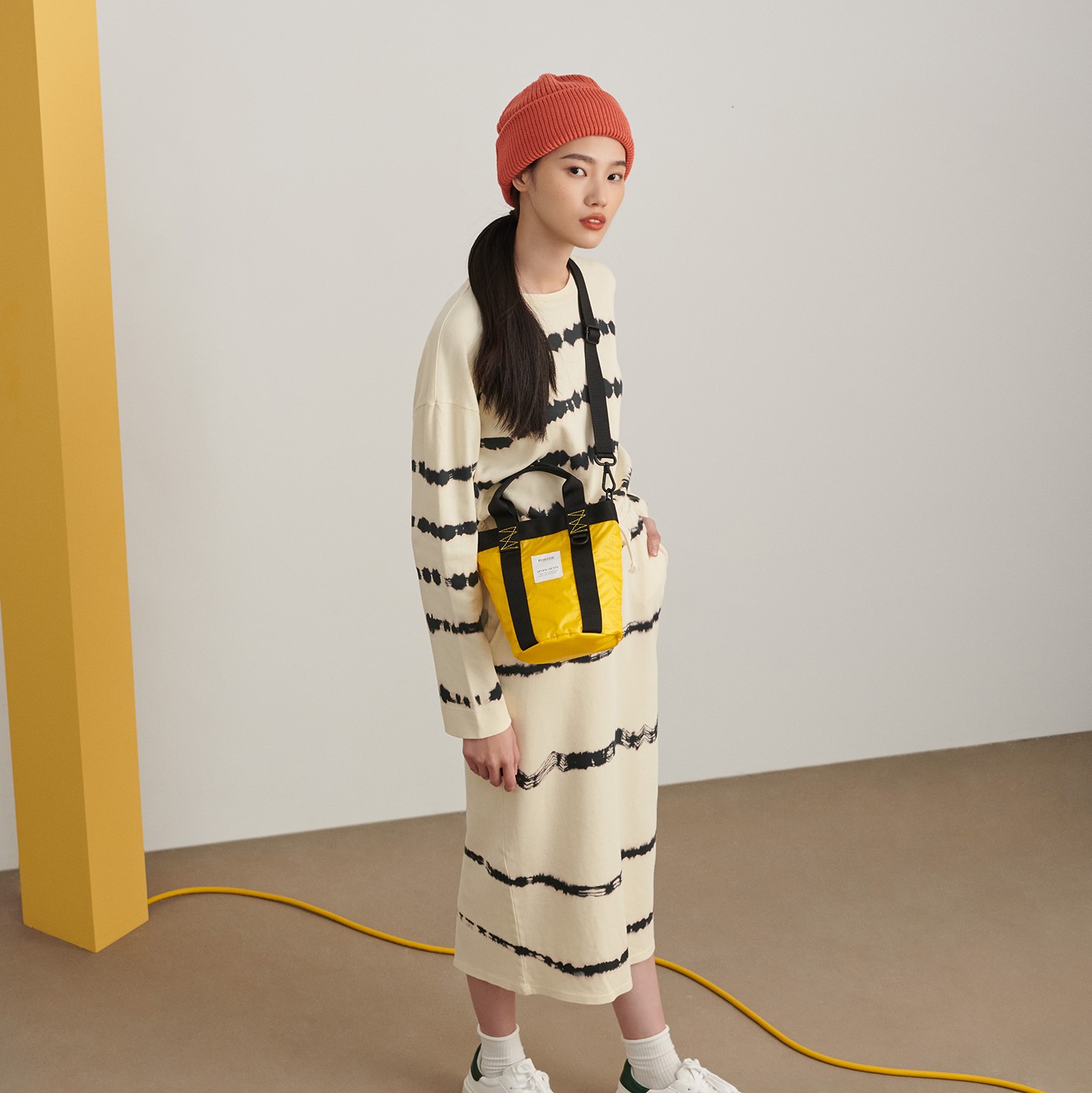 Flate意指填裝飛艇之空氣;選用帆船帆面料之高強力紗線與降落傘同等級,兼具耐用與輕薄特性。調色以活潑個性黑、街頭藍、搶眼橘、風格黃傳達運動性格,為每天出門心情換上最自由的色彩。