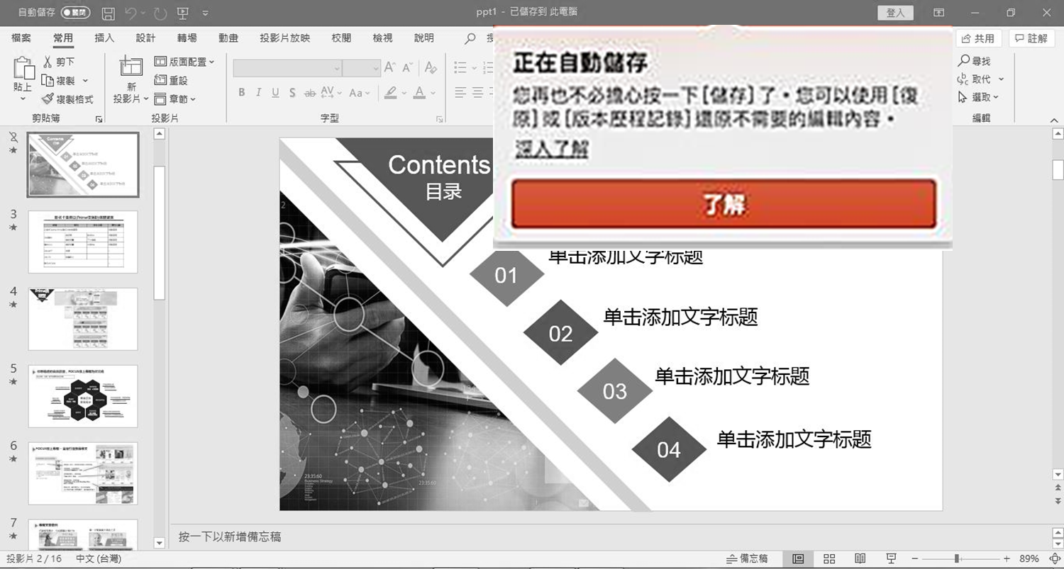 只要開啟在 PowerPoint 、Word 和 Excel 中「自動儲存」的功能,就能在你輸入的每分每秒,不斷將你的檔案自動同步上傳至 OneDrive ,讓你再也不用擔心突如其來的意外當機或關機會讓你的進度歸零。