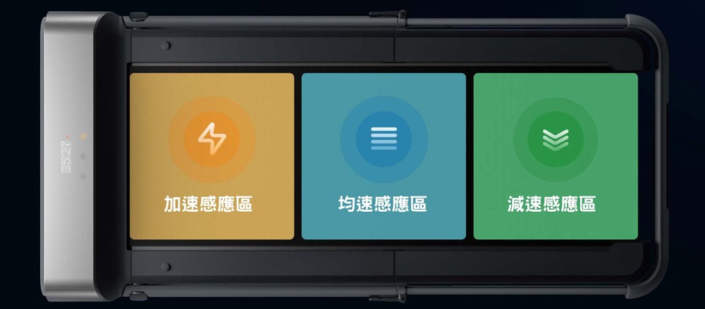 扶手放下使用腳感控速模式,tokuyo 全摺疊智跑機 TT-238 跑板底部設計有壓力傳感器,可以根據跑步的區域調整跑步機的速度。用跨步加減速,模擬戶外健走快步的腳感。