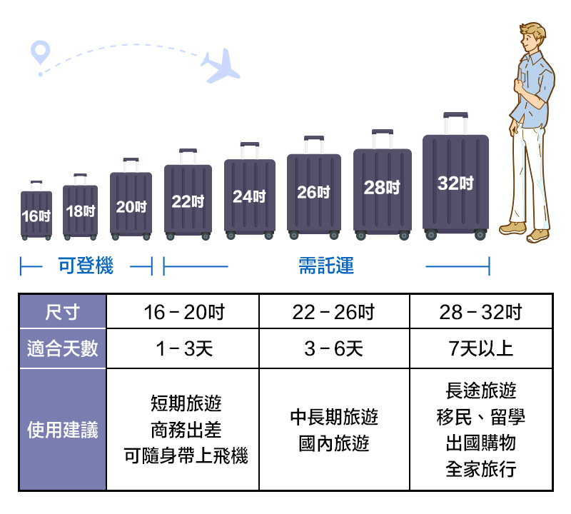 託運箱:20吋以上,以重量計件,無法隨身一起帶上飛機必須託運,如果超過航空公司規定的重量限制需加收超重費用!