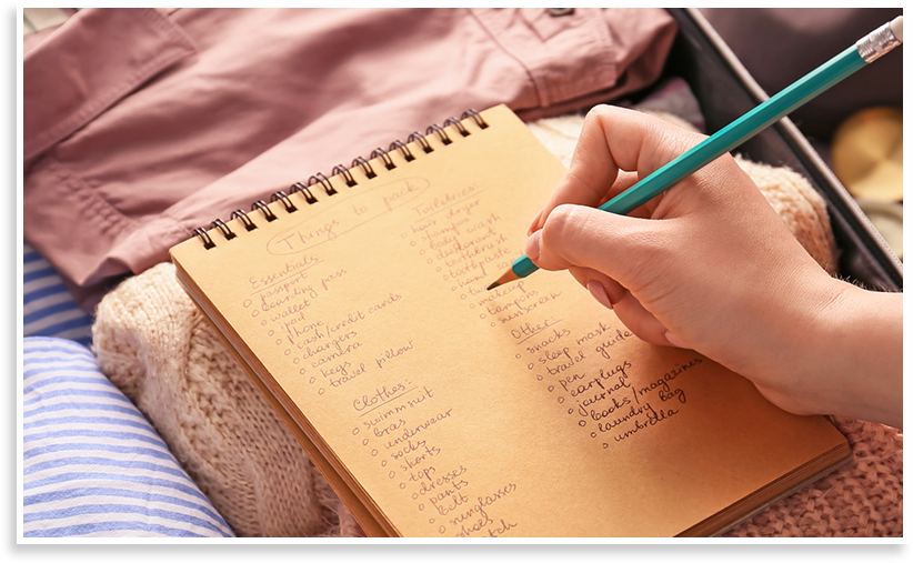 為了避免忘記帶,先將要打包進行李箱的東西條列出來,依照不同季節、旅行地點、個人需求不同,要帶的東西也不太一樣。