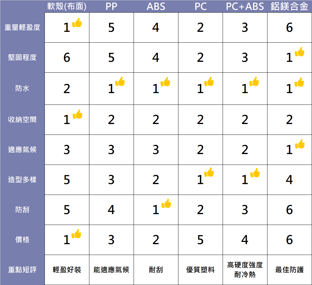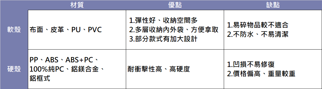 行李箱外殼材質以「硬」、「軟」殼來區分。