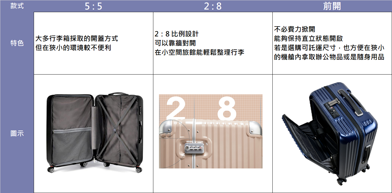 行李箱可分為登機箱、託運箱兩種類別。在挑選行李箱時,記得先上航空公司官網確認尺寸規定喔。