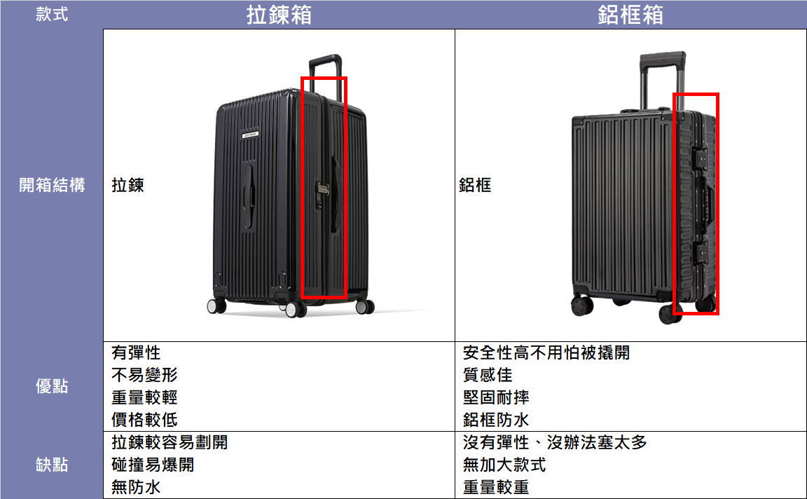 硬殼行李箱以開蓋方式的不同,又分為【拉鍊箱】或【鋁框箱】的型式。