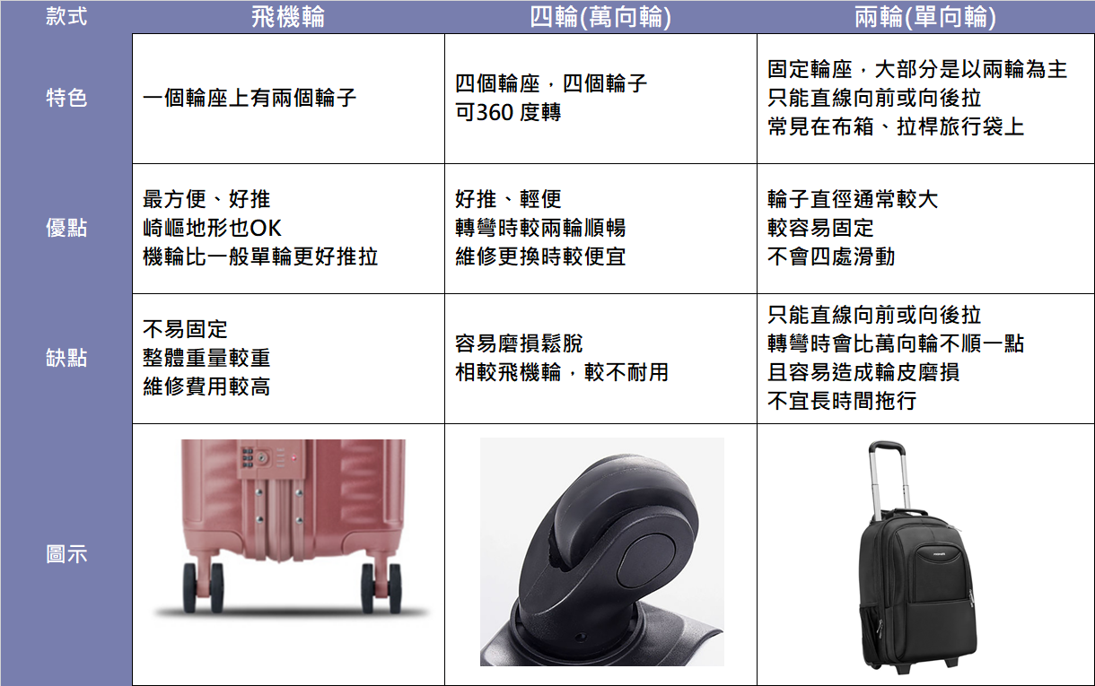 俗話說的好,好推好拉的行李箱帶你上天堂!所以輪子也是很重要考量的一點,尤其如果去到某些地點遇到石板路,就是考驗行李箱的時刻了!