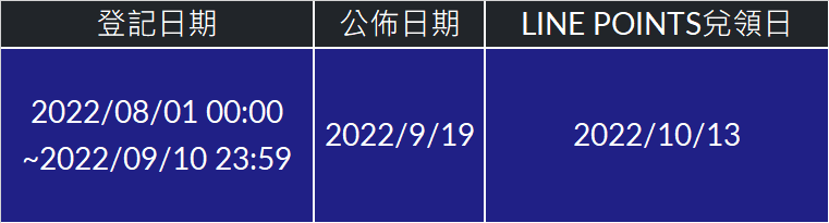 5. 【LINE POINTS 100萬點兌換券】得獎兌換方式: 得獎人於 2022/10/13 之指定領獎時間(10:00-17:00)攜帶身分證明文件及已安裝並登入LINE APP的智慧型手機 至台北市大安區敦化南路二段105號12樓報到,主辦單位確認得獎人身分後即可進行領獎,兌領獎項時需以智慧型手機至LINE兌換頁面:https://help2.line.me/linepoints/ios/pc?lang=zh-Hant,領獎程序約30分鐘至一小時。