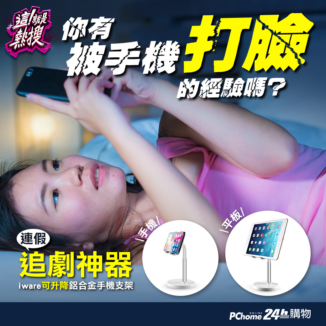 不要被這張圖誤導了,我們才不是叫你躺在床上工作呢!我們是想讓你在工作上更有效率,用電腦手機雙機作業啦。看看這款高度可升降、角度可調整、穩定不傾倒的 iware 可升降鋁合金手機支架,。
